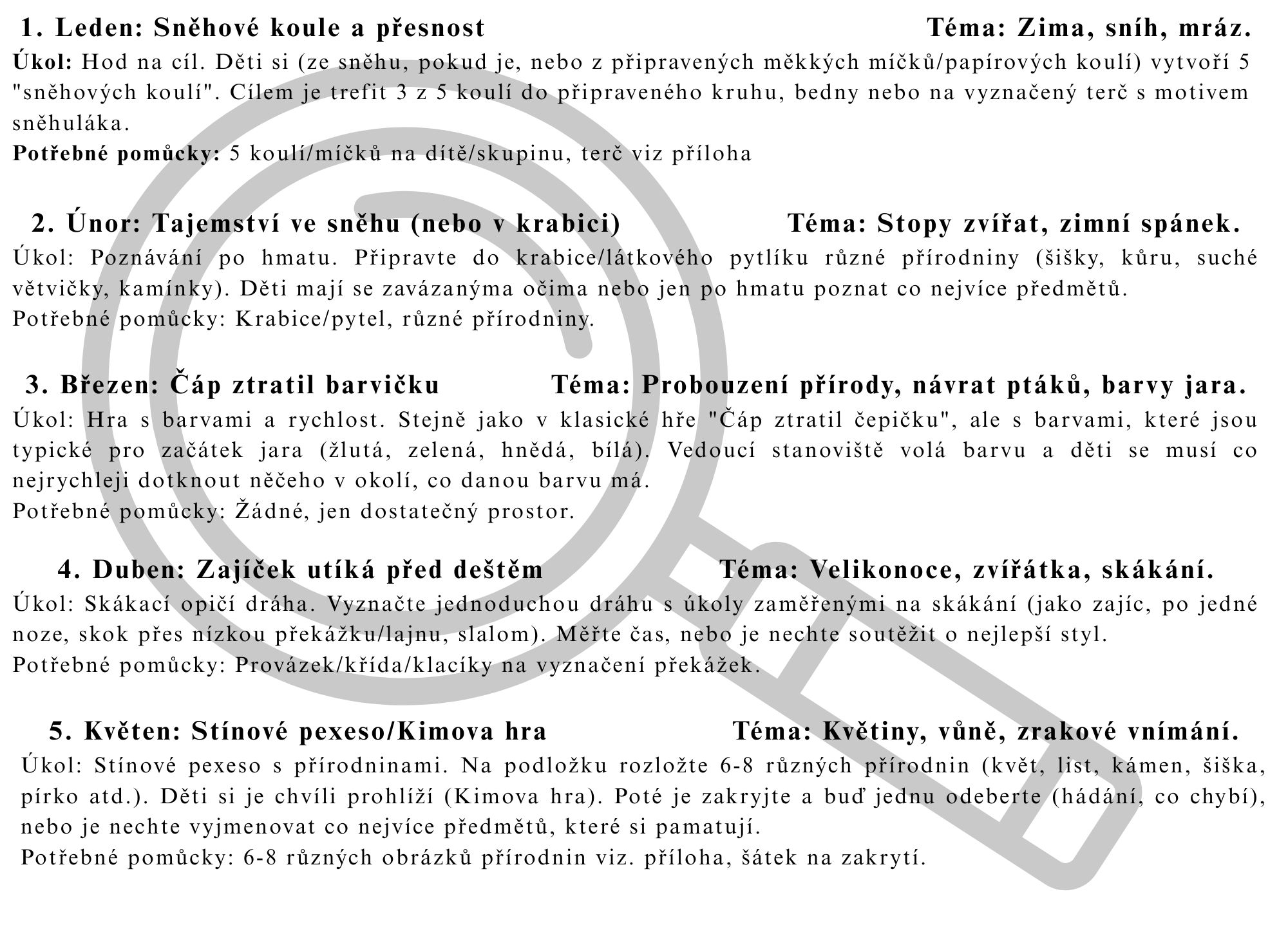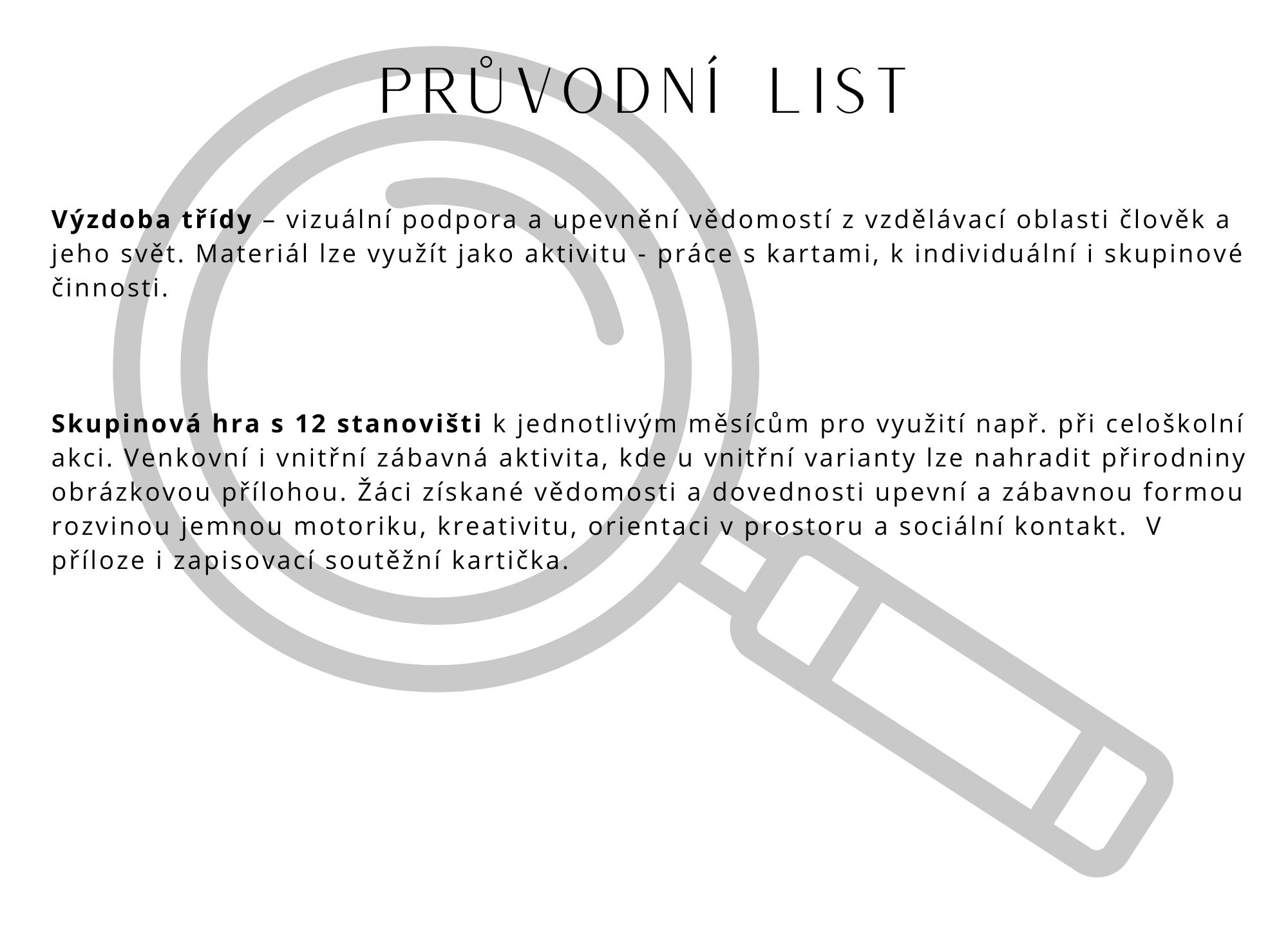 Skupinová hra s 12 stanovišti k jednotlivým měsícům pro využití např. při celoškolní akci. Venkovní i vnitřní zábavná aktivita, kde u vnitřní varianty lze nahradit přirodniny obrázkovou přílohou. Žáci získané vědomosti a dovednosti upevní a zábavnou formou rozvinou jemnou motoriku, kreativitu, orientaci v prostoru a sociální kontakt. V příloze i zapisovací soutěžní kartička