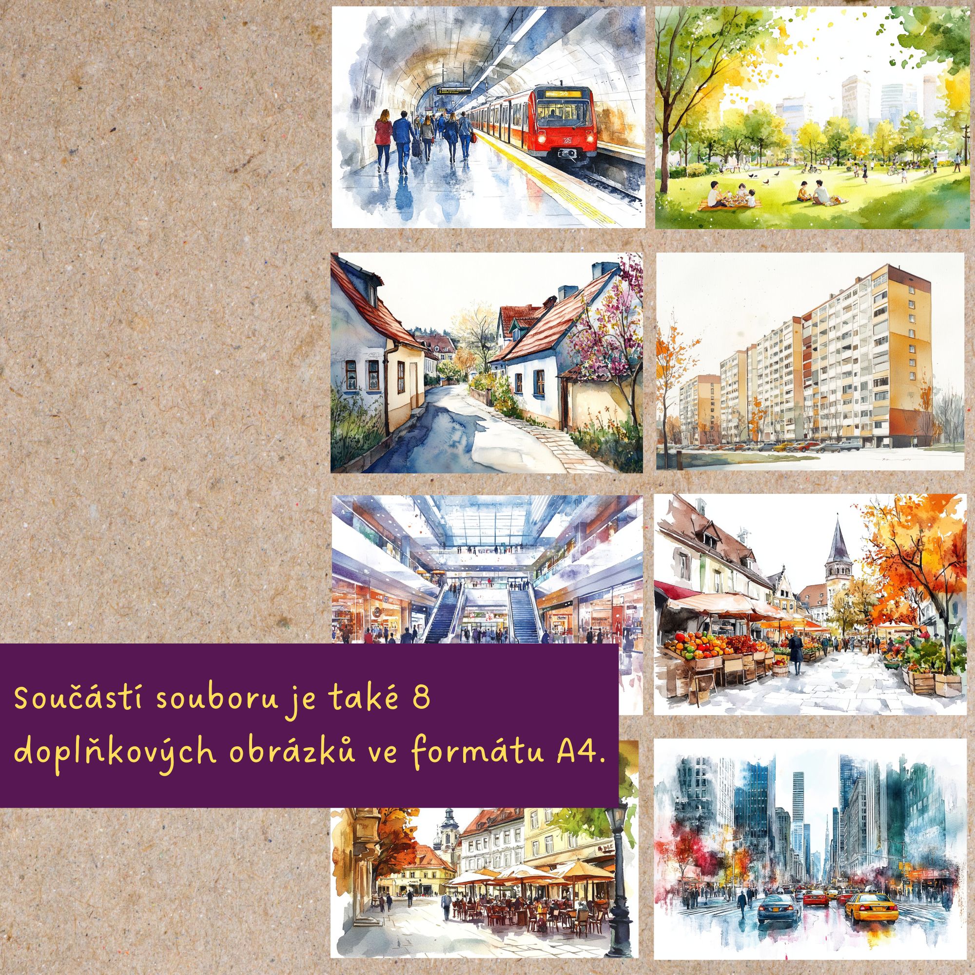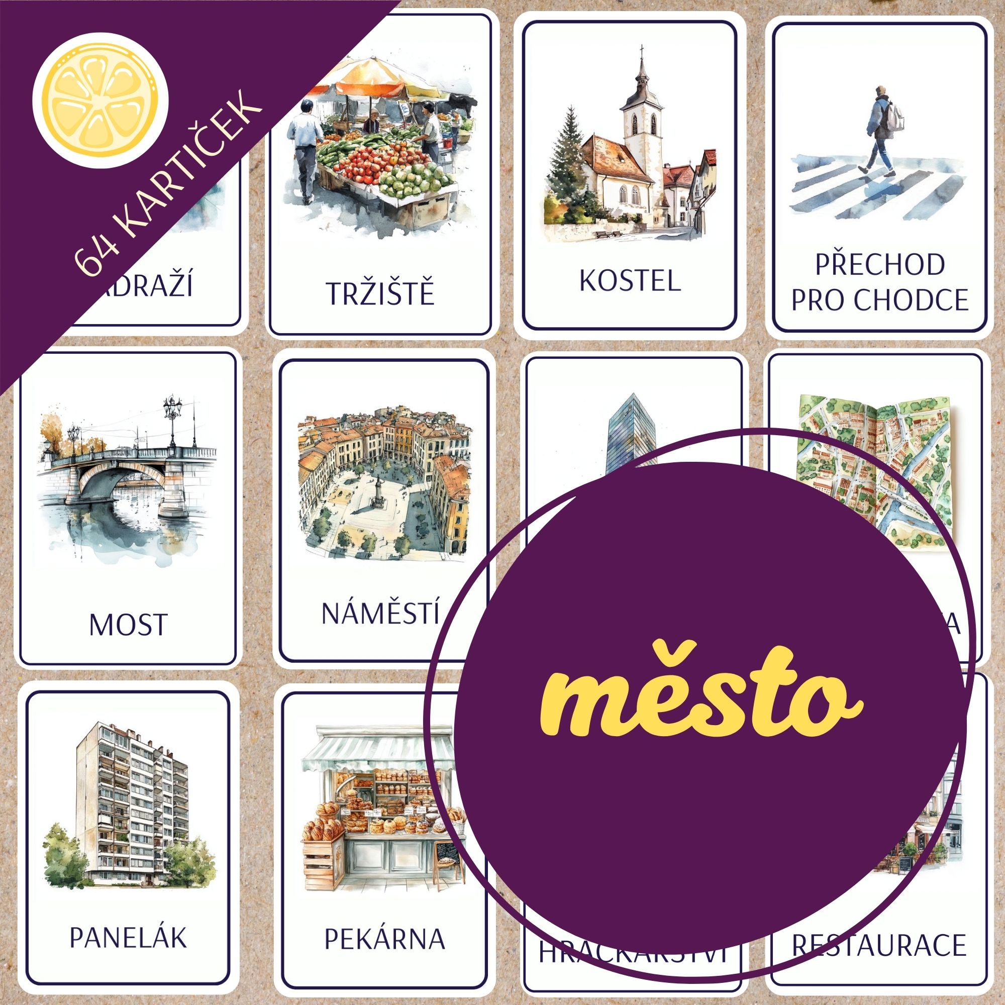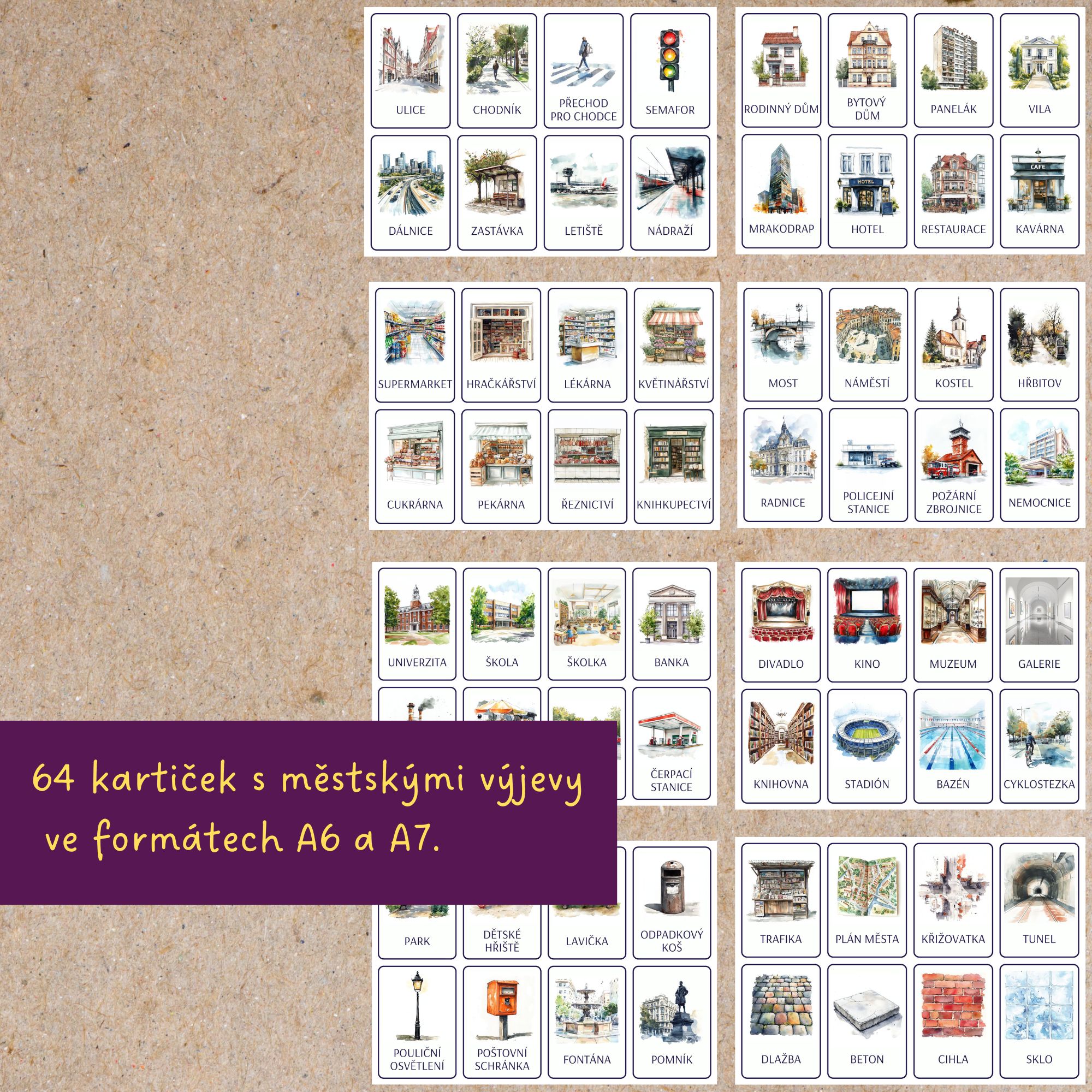 🏙️Součástí sady je 64 kartiček ve formátech A6 a A7 a 8 doplňkových obrázků ve formátu A4. Balíček je určen pro děti a studenty všech věkových kategorií pracující s tématem města. Využijete je v prvouce, vlastivědě, při výuce cizích jazyků nebo i v hodinách českého jazyka a tvůrčího psaní.