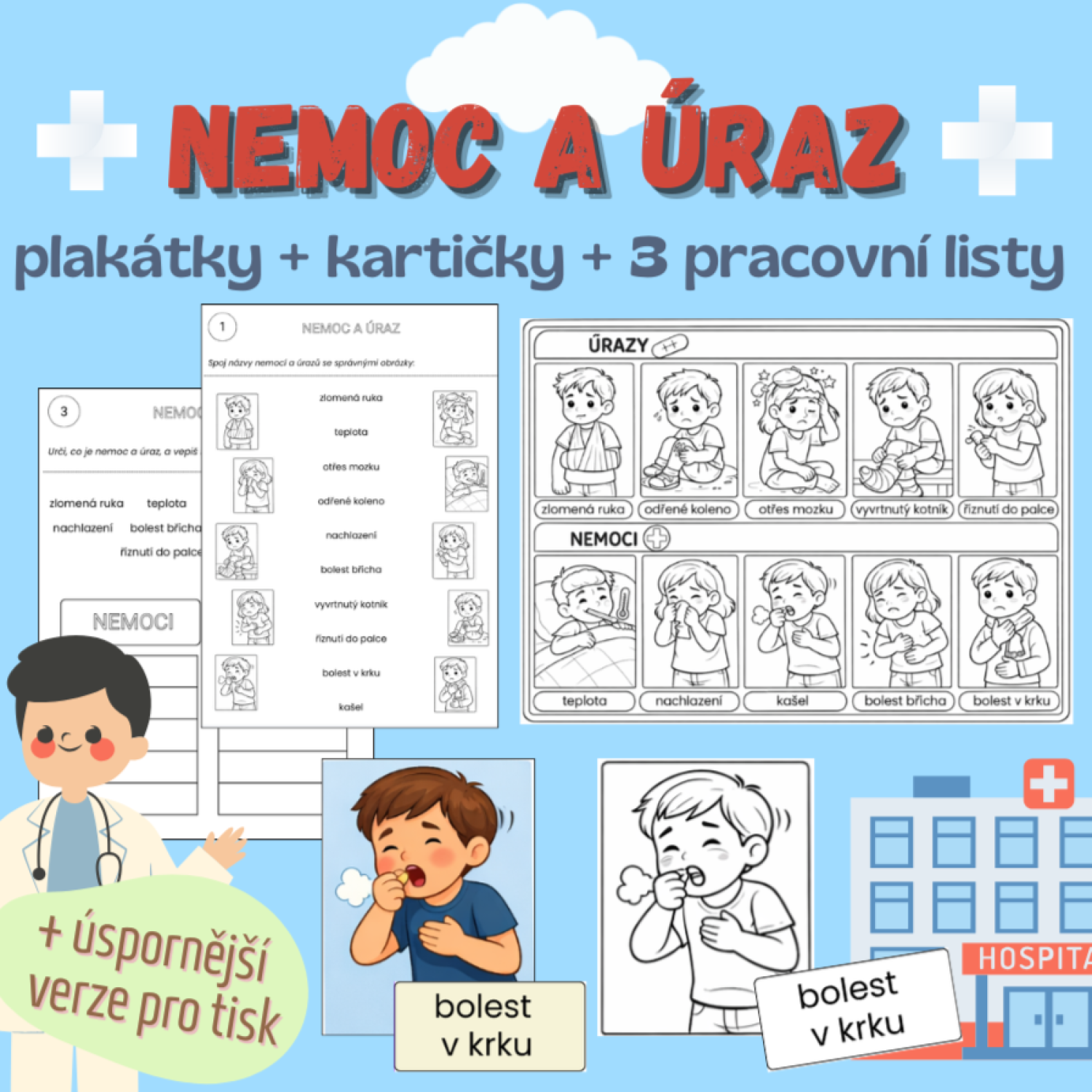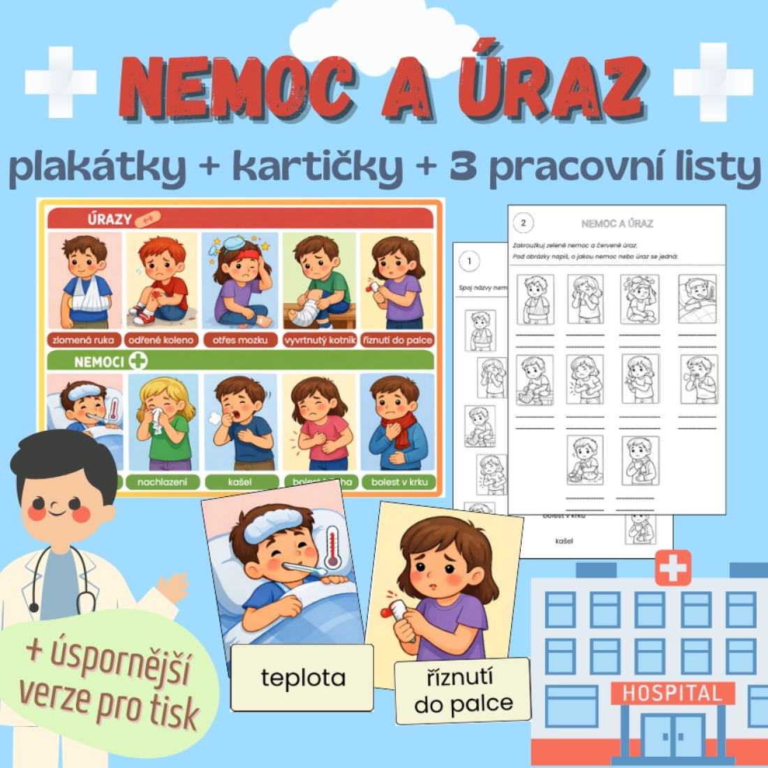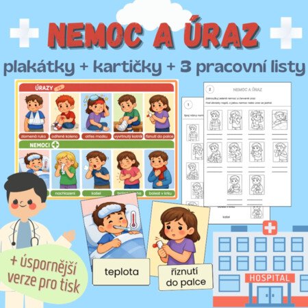 - Úvod do tématu - Co je úraz a co je nemoc? Využijte plakátky jako vizuální oporu a společně si vysvětlete rozdíly.