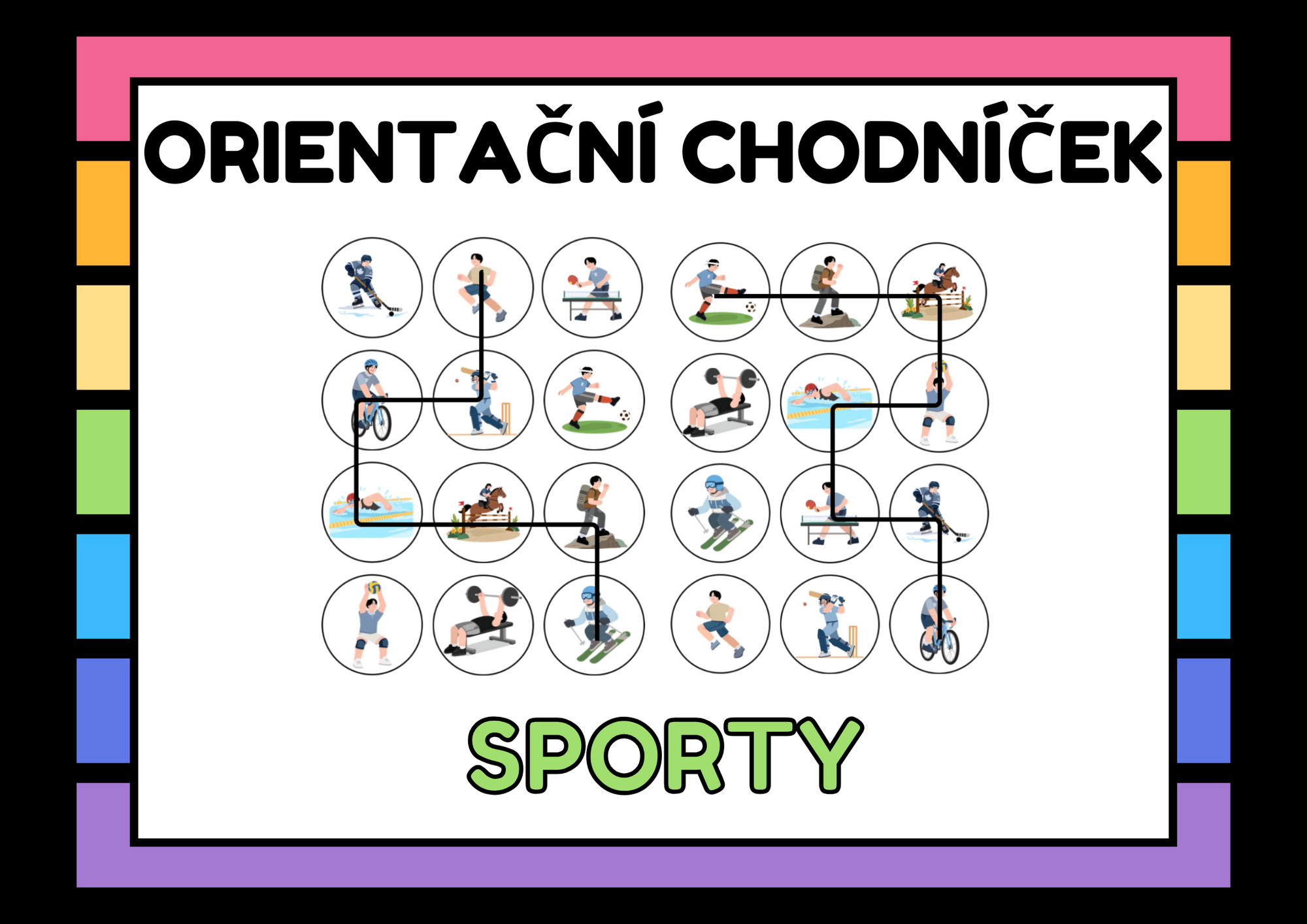 Zábavný venkovní nebo vnitřní orientační chodníček pro děti, který propojuje pohyb a poznávání sportů.
