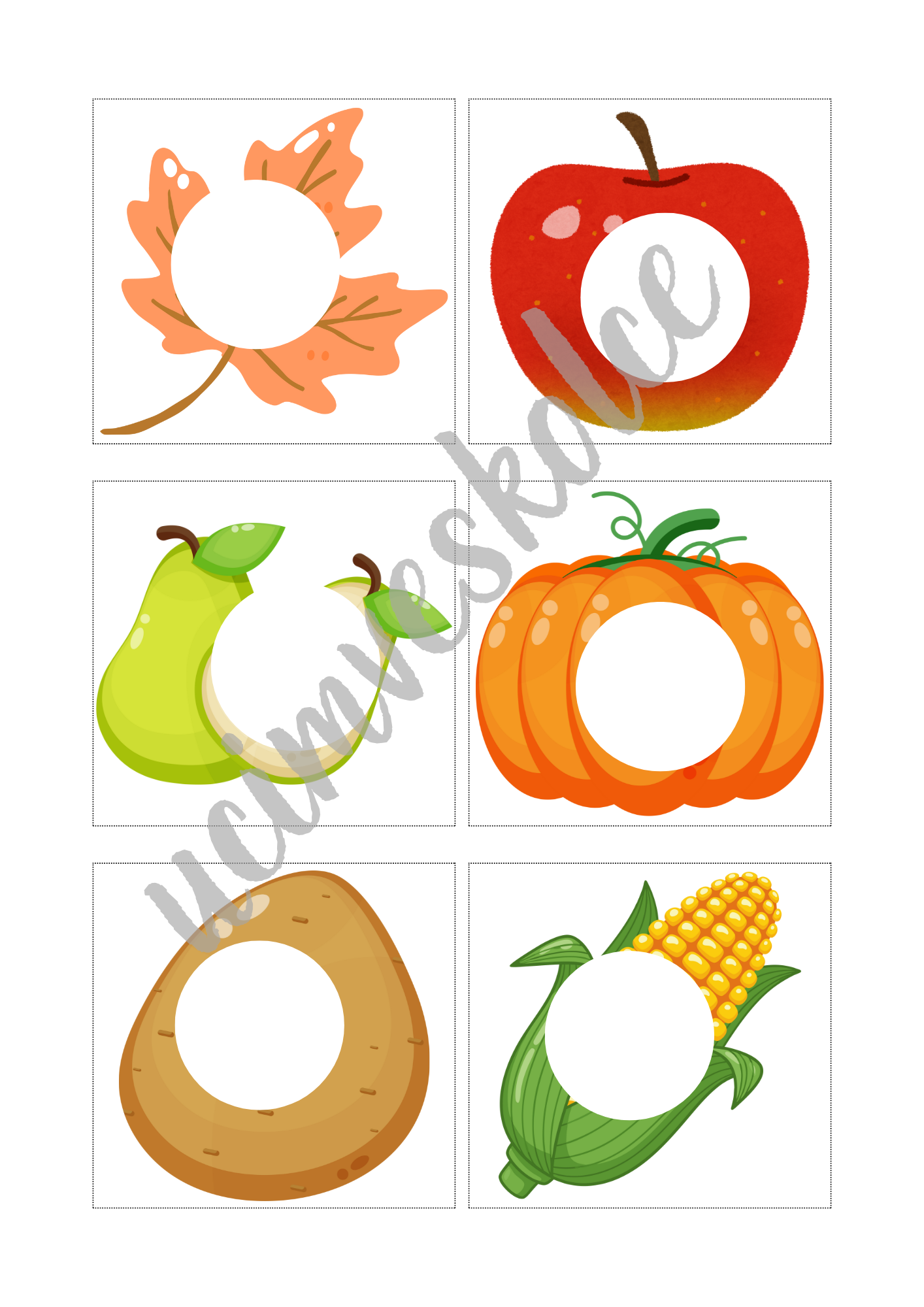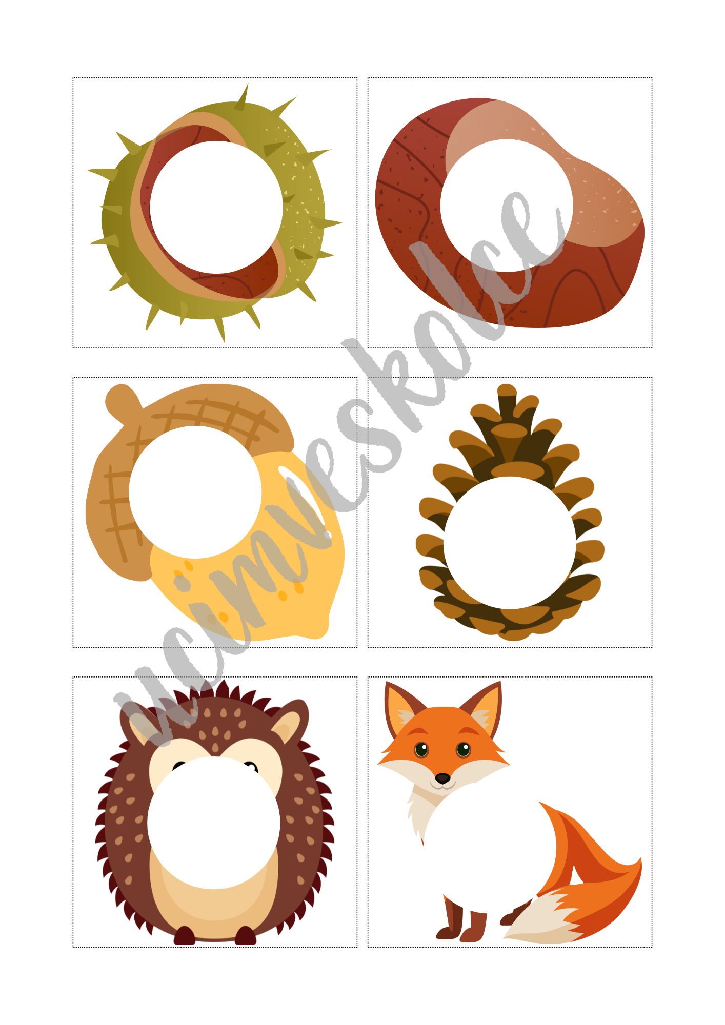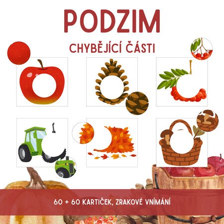 Na každé kartičce je obrázek, ve kterém kousek chybí (vyznačeno bílým kruhem).