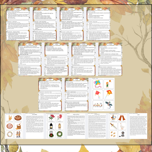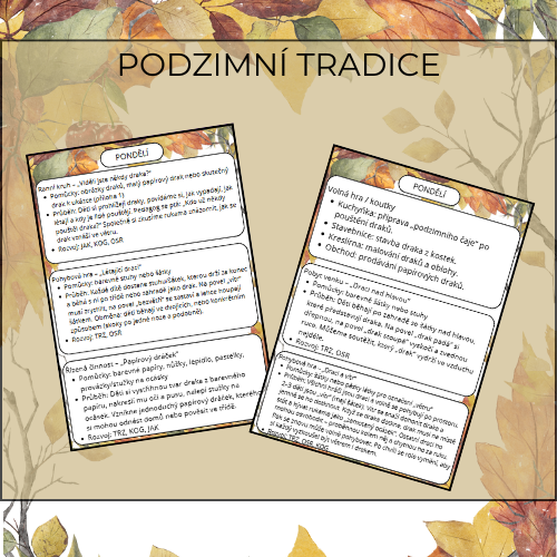 🍂 Podzim je plný zvyků a tradic, které lidé slaví už po mnoho generací. Pouštění draků, dožínky a hody, Dušičky, svatý Martin i začátek adventu – každý den přináší jiný příběh, symboly a radosti. Tento digitální materiál „Podzimní tradice“ vám nabídne ucelený program na celý týden, díky kterému děti hravou formou poznají pět významných podzimních tradic.