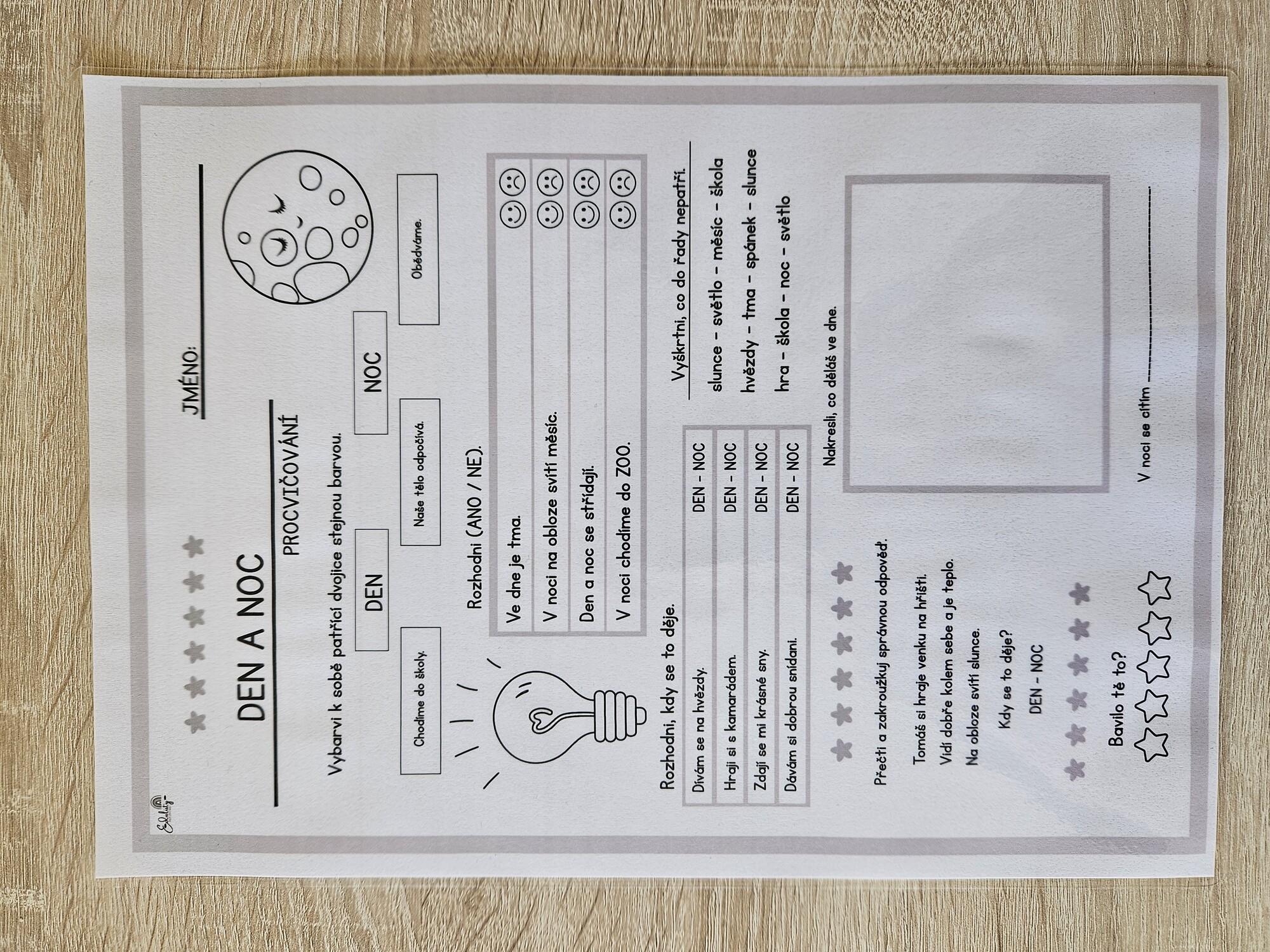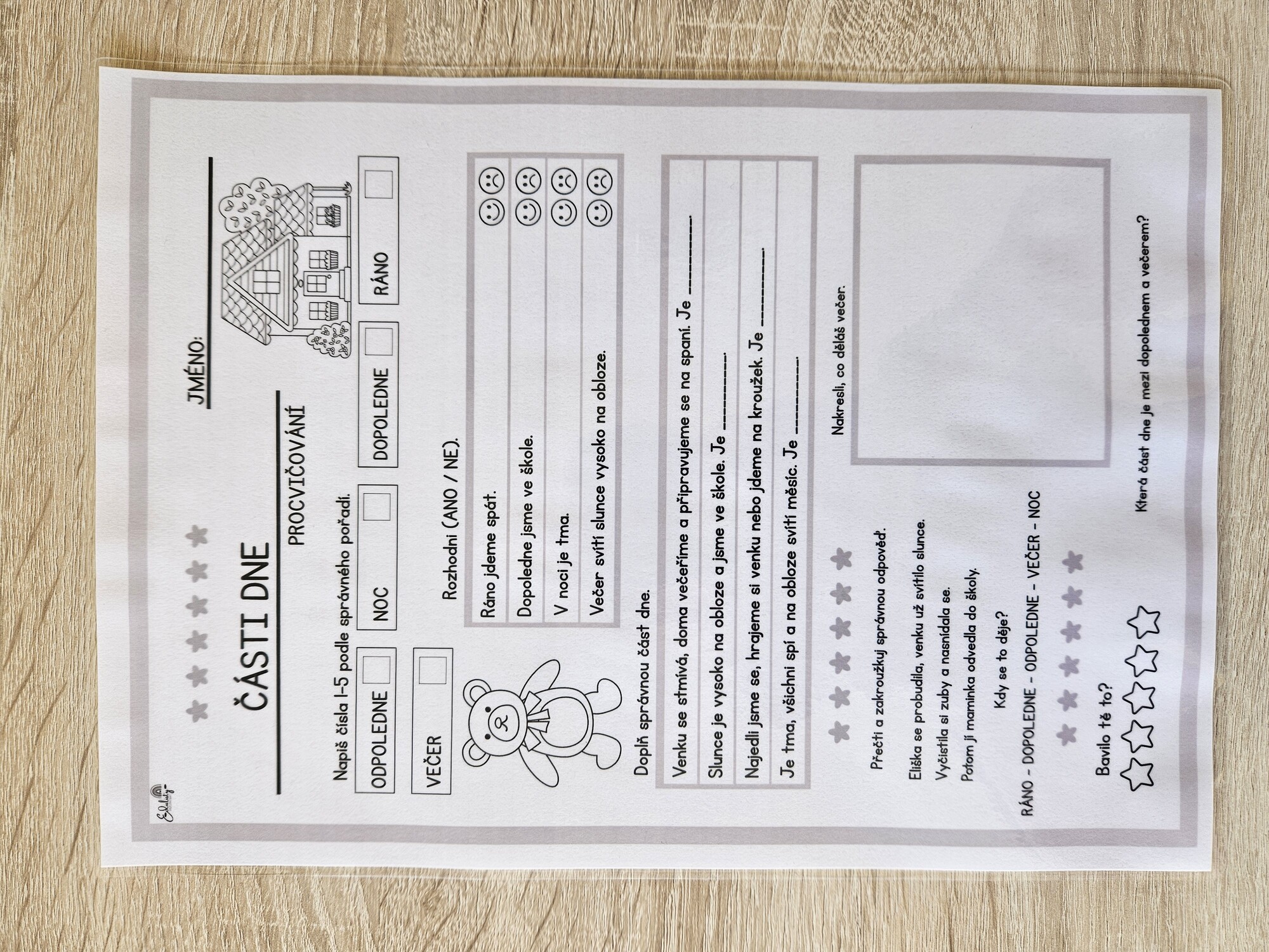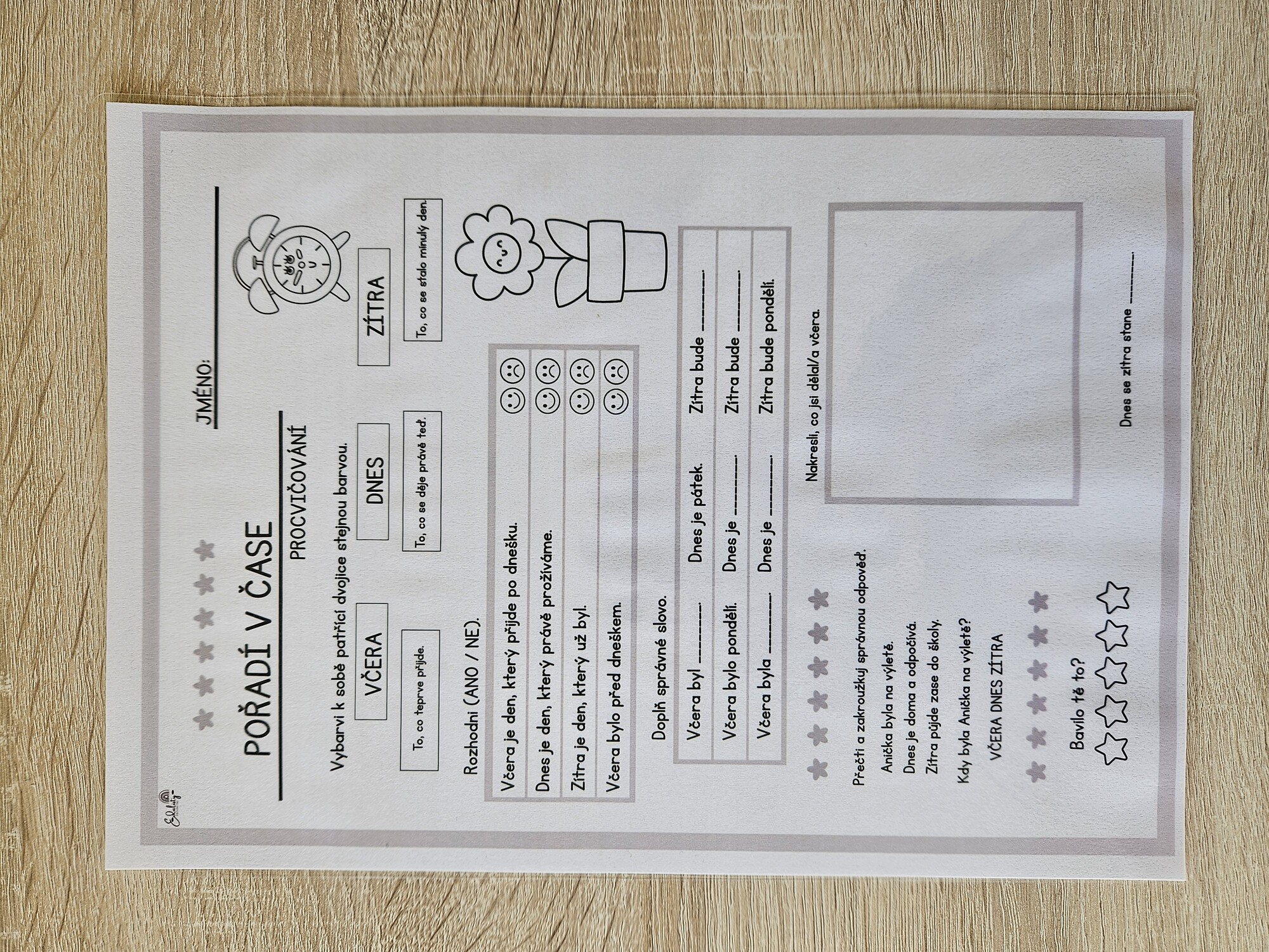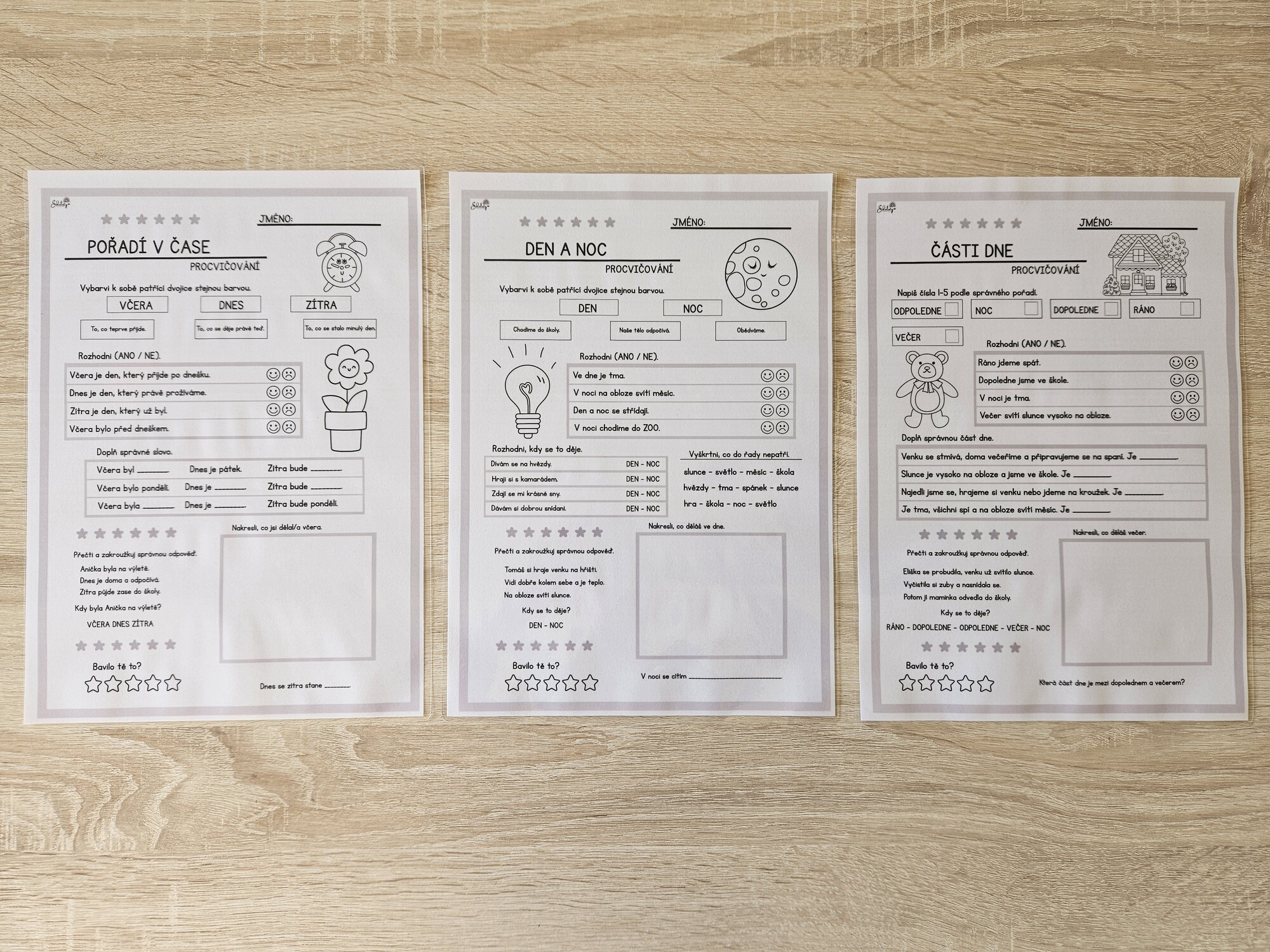 Materiál je zaměřen na upevnění základních časových pojmů a orientaci v běžném denním režimu. Děti pracují s pojmy včera – dnes – zítra, rozlišují den a noc a procvičují správné pořadí částí dne (ráno – dopoledne – odpoledne – večer – noc).