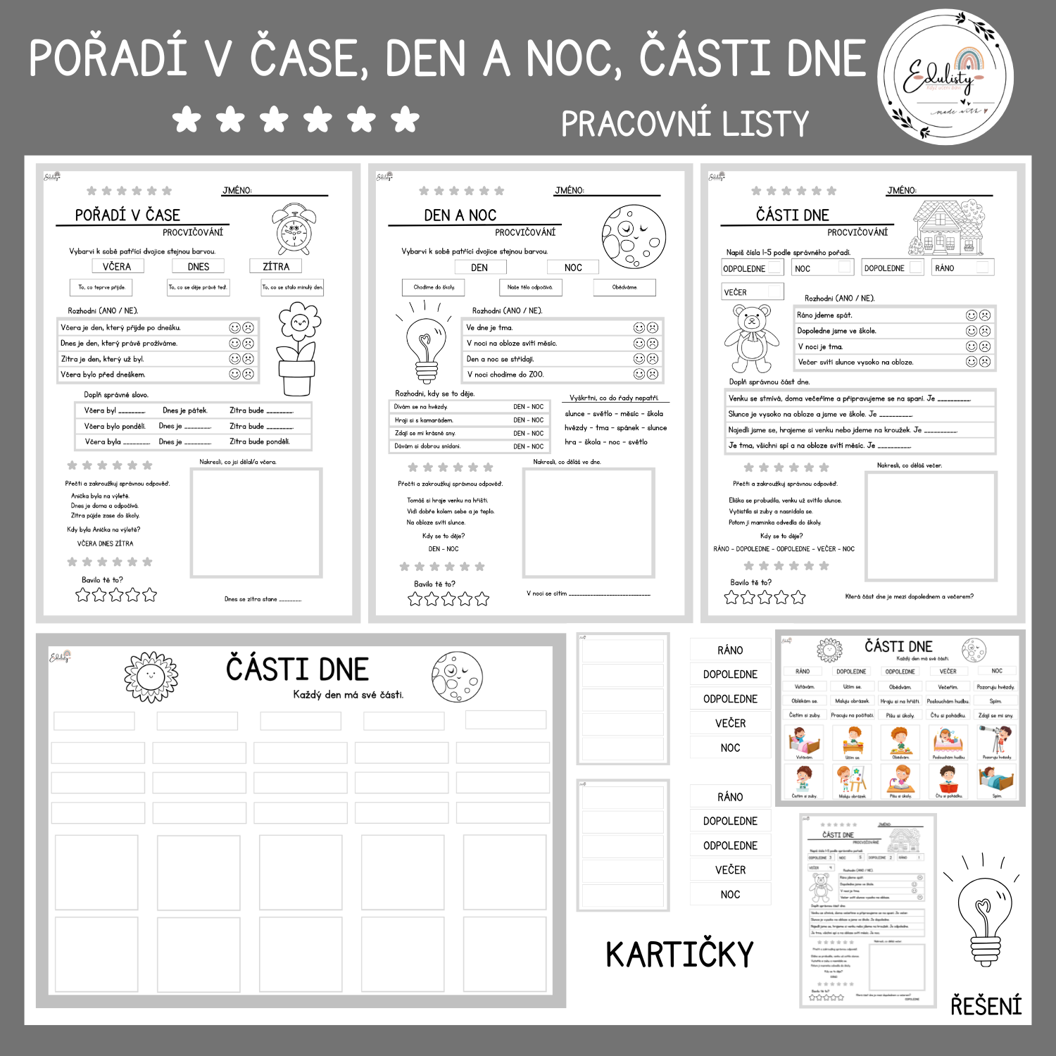 Tento materiál obsahuje vybrané pracovní listy, které jsou převzaty z tematické sady ČAS KOLEM NÁS – Pořadí v čase, Den a noc, Části dne. Tyto pracovní listy se v uvedených sadách mohou opakovat. Pokud plánujete zakoupení celých sad, doporučuji nejprve zvážit tuto skutečnost, aby nedošlo k duplicitnímu nákupu.