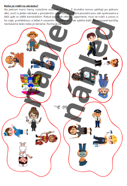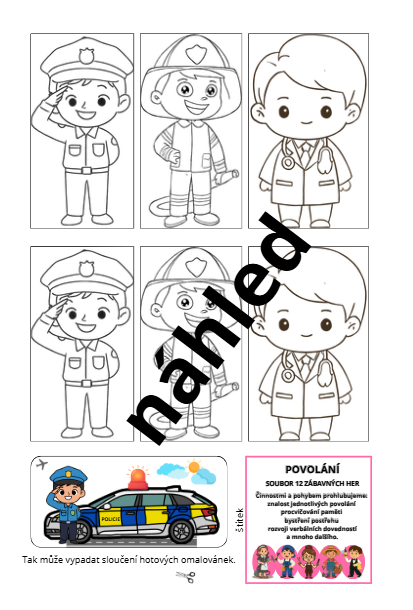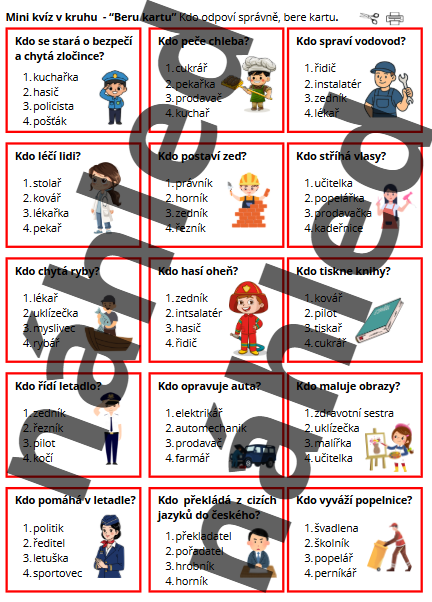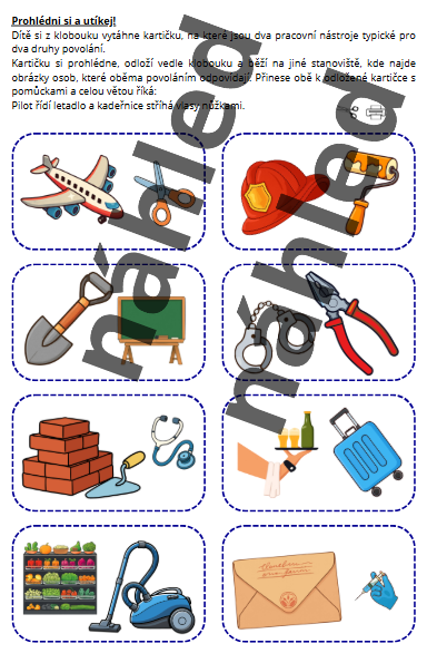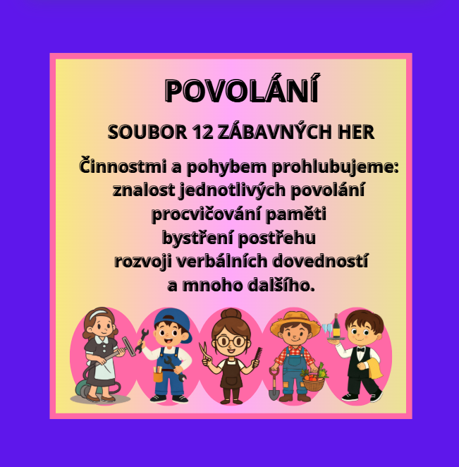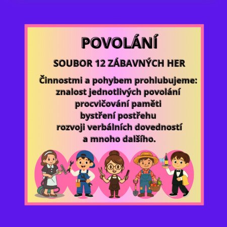 stáhněte si soubor, který může pomoci při zábavném procvičování znalosti různých druhů povolání. Soubor je koncipován tak, aby obsahoval různé typy zábavy a her, které jsou vesměs zaměřeny nejen na znalost jednotlivých povolání a jejich obsah, ale také na procvičování paměti, postřehu a především na rozvoji verbálních dovedností. Setkáte se zde s několika typy her.