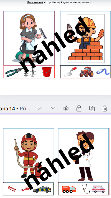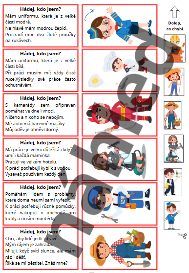 V 6 páscích s jednotlivými povoláními chybí vždy jedno. Které? Děti dolepují z nabídky 6 malých kartiček
