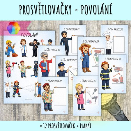 Soubor obsahuje 12 prosvětlovacích karet s motivy nejznámějších povolání na a přehledný plakát, který lze využít k povídání, třídění nebo jako přehled do třídy. Pro použití stačí baterka nebo svítilna, tiskárna, nůžky a lepidlo.