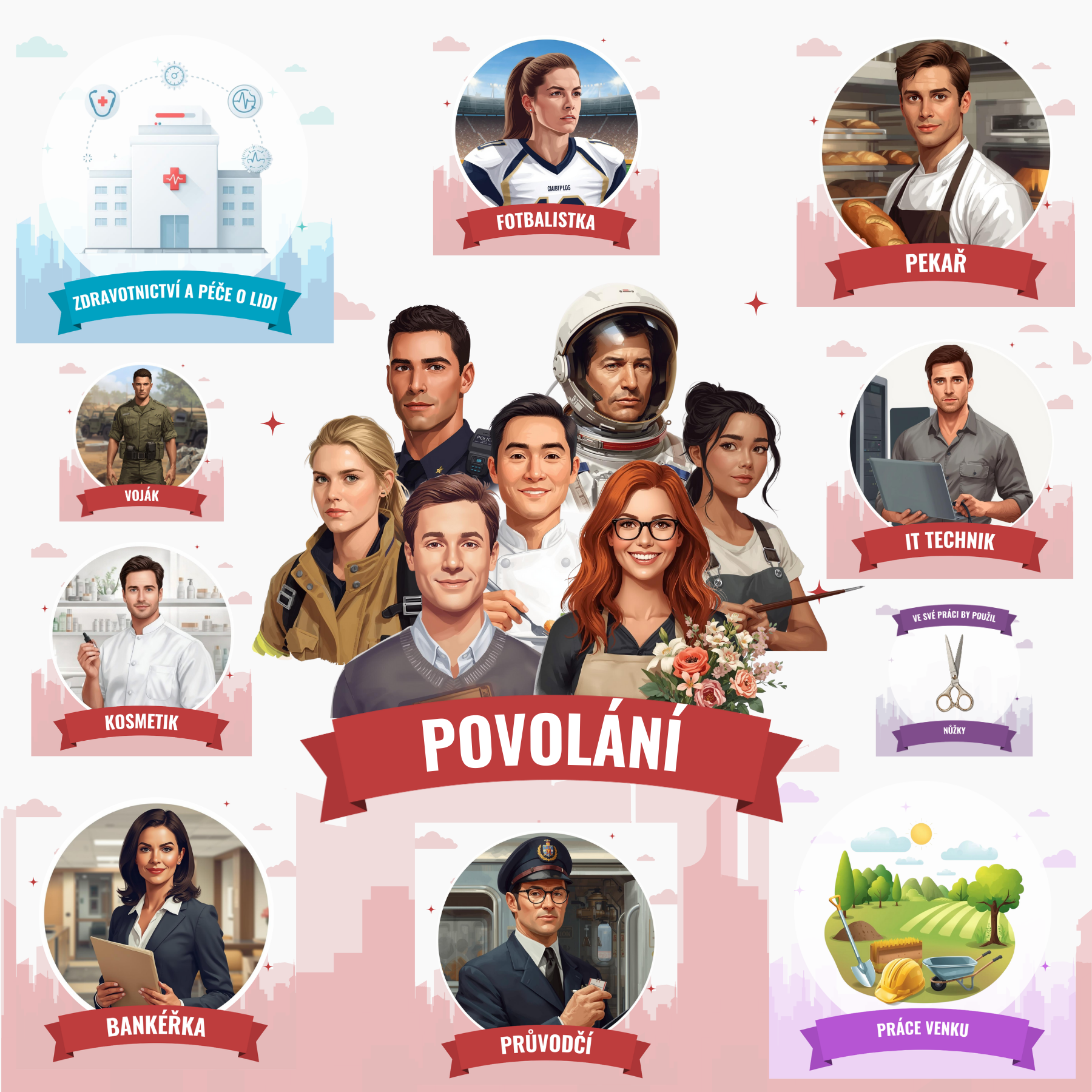 Sada obsahuje 102 povolání, vždy v ženské i mužské podobě (celkem 204 karet). Toto pojetí dětem přirozeně ukazuje, že žádné povolání není „jen pro muže“ nebo „jen pro ženy“ a že každý si může vybrat, čím chce být. Postavy jsou navíc zpracovány rozmanitě – liší se vzhledem, barvou pleti, účesy, doplňky i drobnými znaky (např. brýle, pihy), aby bylo zřejmé, že svět práce je otevřený všem.