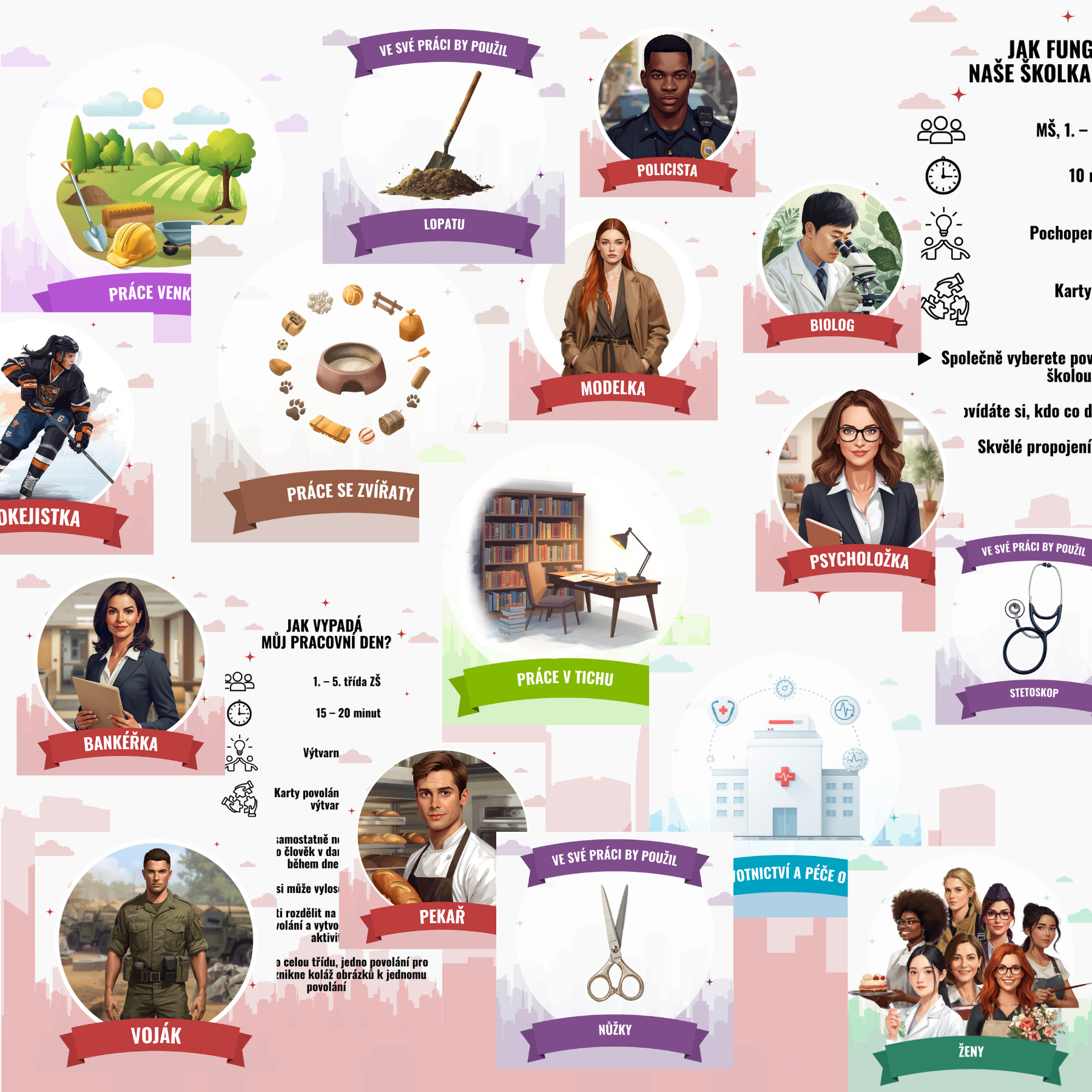 Materiál neobsahuje pevné řešení – třídění nevyžaduje odborné řazení. Pedagog i děti mohou povolání rozdělovat podle sebe, případně s oporou o doplňující informace k jednotlivým profesím, které pomáhají s orientací a pochopením jejich specifik.