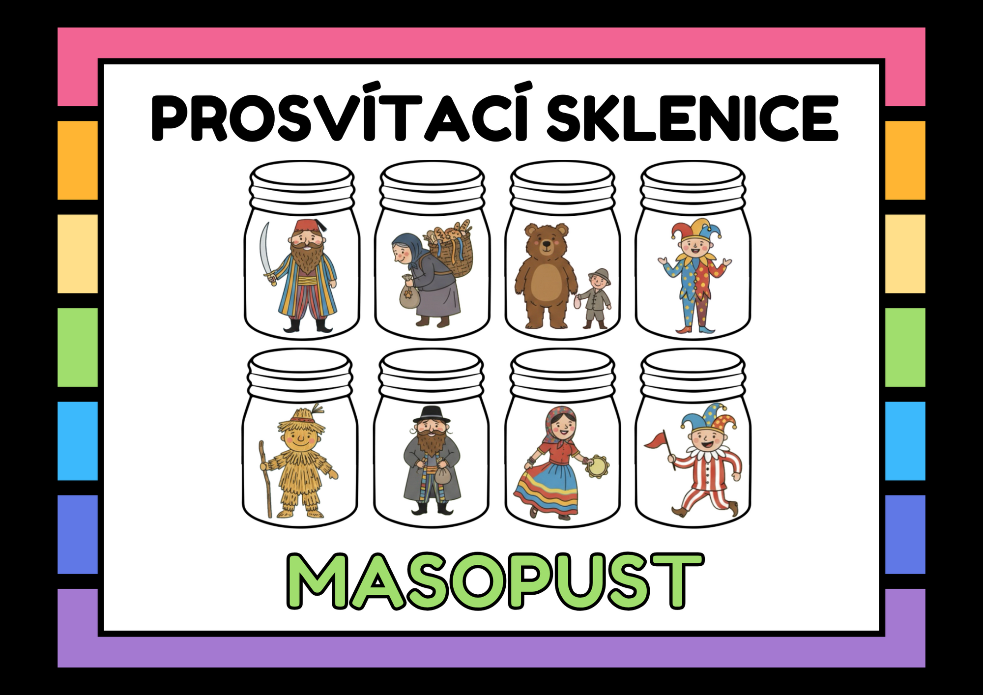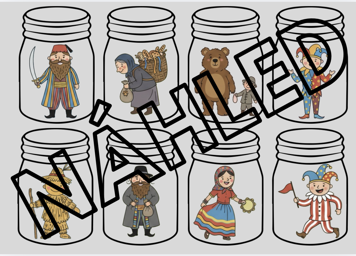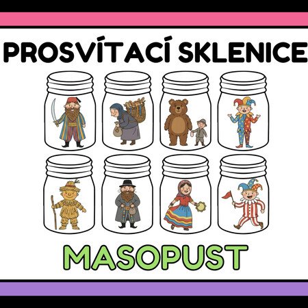 Do průhledných sklenic jsou vloženy obrázky k tématu Masopustu. Sklenice se nasvítí baterkou, přes okno nebo se položí na světelný stůl, obrázky se krásně prosvítí. Děti poznávají a pojmenovávají, co vidí ve sklenicích.