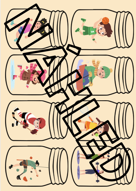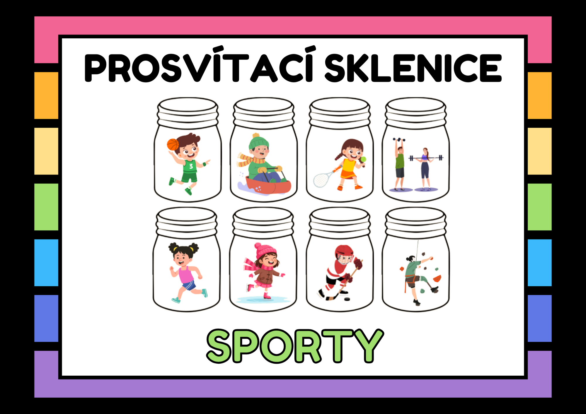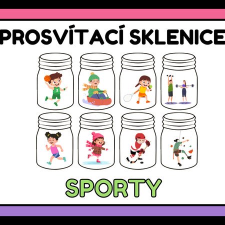 Do průhledných sklenic jsou vloženy obrázky sportů. Sklenice se nasvítí baterkou, přes okno nebo se položí na světelný stůl, obrázky se krásně prosvítí. Děti poznávají a pojmenovávají, co vidí ve sklenicích.