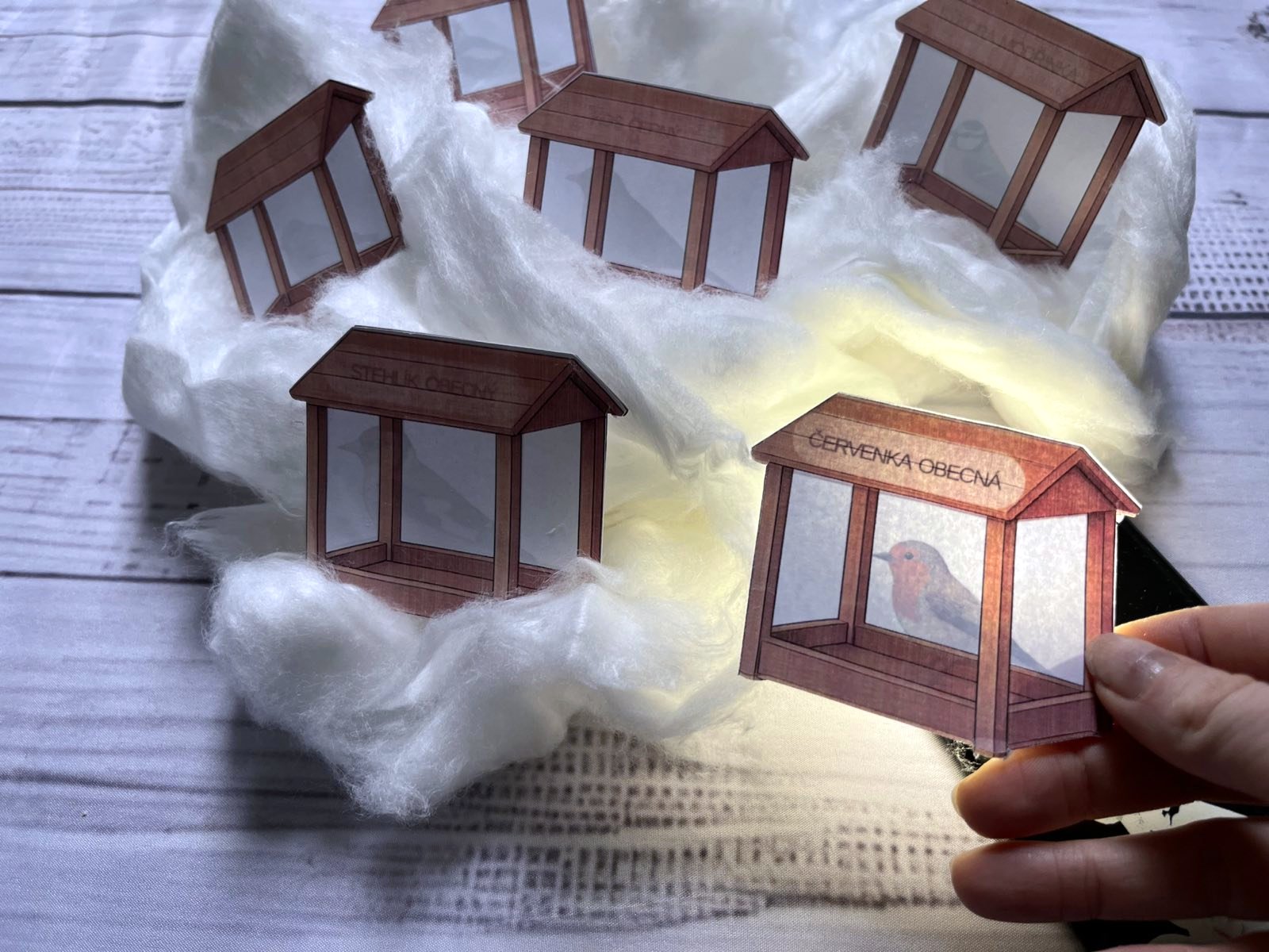 Soubor obsahuje 12 prosvětlovacích karet s motivy ptáků na krmítku a plakát, který lze využít k povídání, třídění nebo jako přehled do třídy. Pro použití stačí baterka nebo svítilna, tiskárna, nůžky a lepidlo.