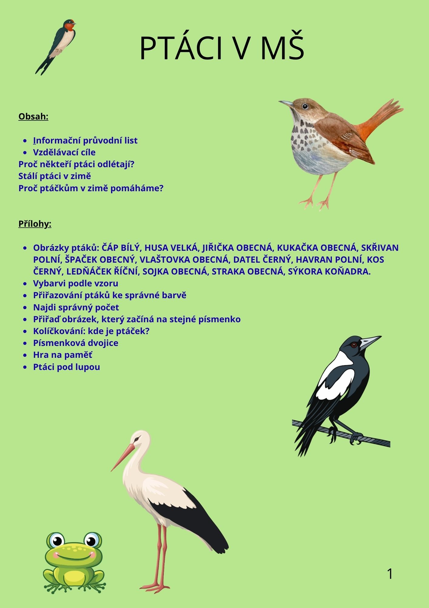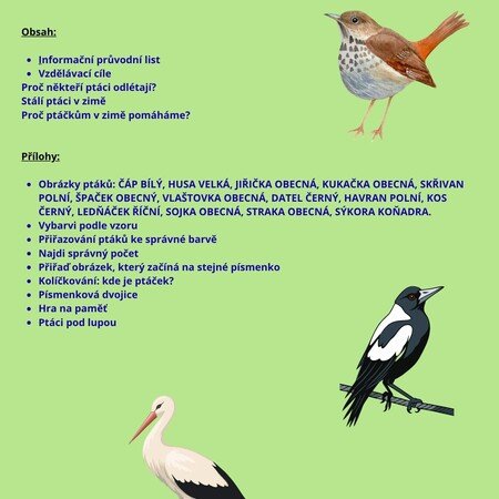 Obrázky ptáků: ČÁP BÍLÝ, HUSA VELKÁ, JIŘIČKA OBECNÁ, KUKAČKA OBECNÁ, SKŘIVAN