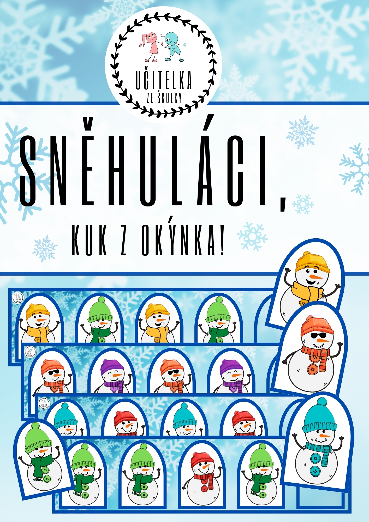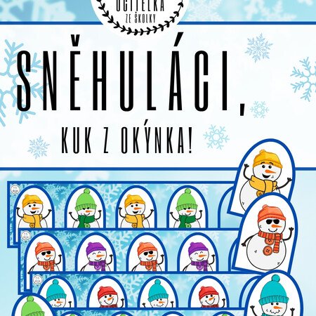 soubor obsahuje 9 karet s barevnými sněhuláky v okýnku a 9 samostatných okýnek se barevným sněhulákem