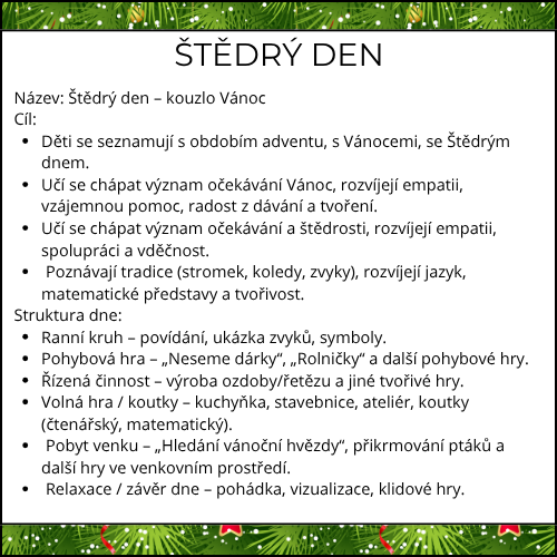 Řízené činnosti – Sváteční prostírání, papírová hvězda z proužků, přírodní koláž, cukroví z modelíny, zkoušíme zvyky (házení botou, jablíčko–hvězdička s dohledem, „lodičky“ bez plamene, společné zametání).