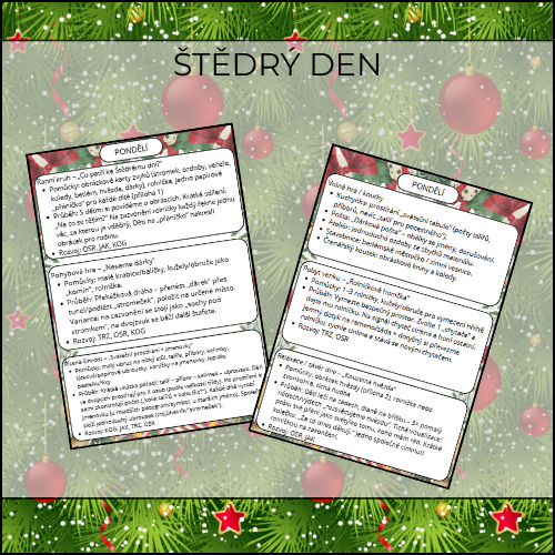 Když ve třídě cinknou rolničky, rozsvítí se papírové hvězdy a děti objevují jednoduché vánoční zvyky, začíná kouzelné předvánoční období. Digitální materiál „Štědrý den“ dětem hravou formou ukáže smysl štědrosti, čekání a rodinných tradic – přes pohyb, tvoření, smyslové hry i klidné závěry dne.