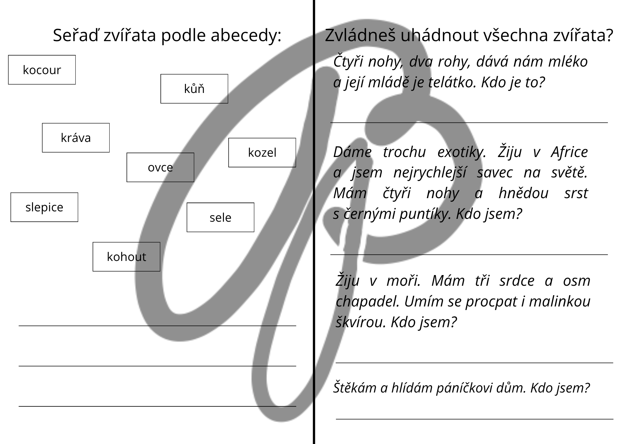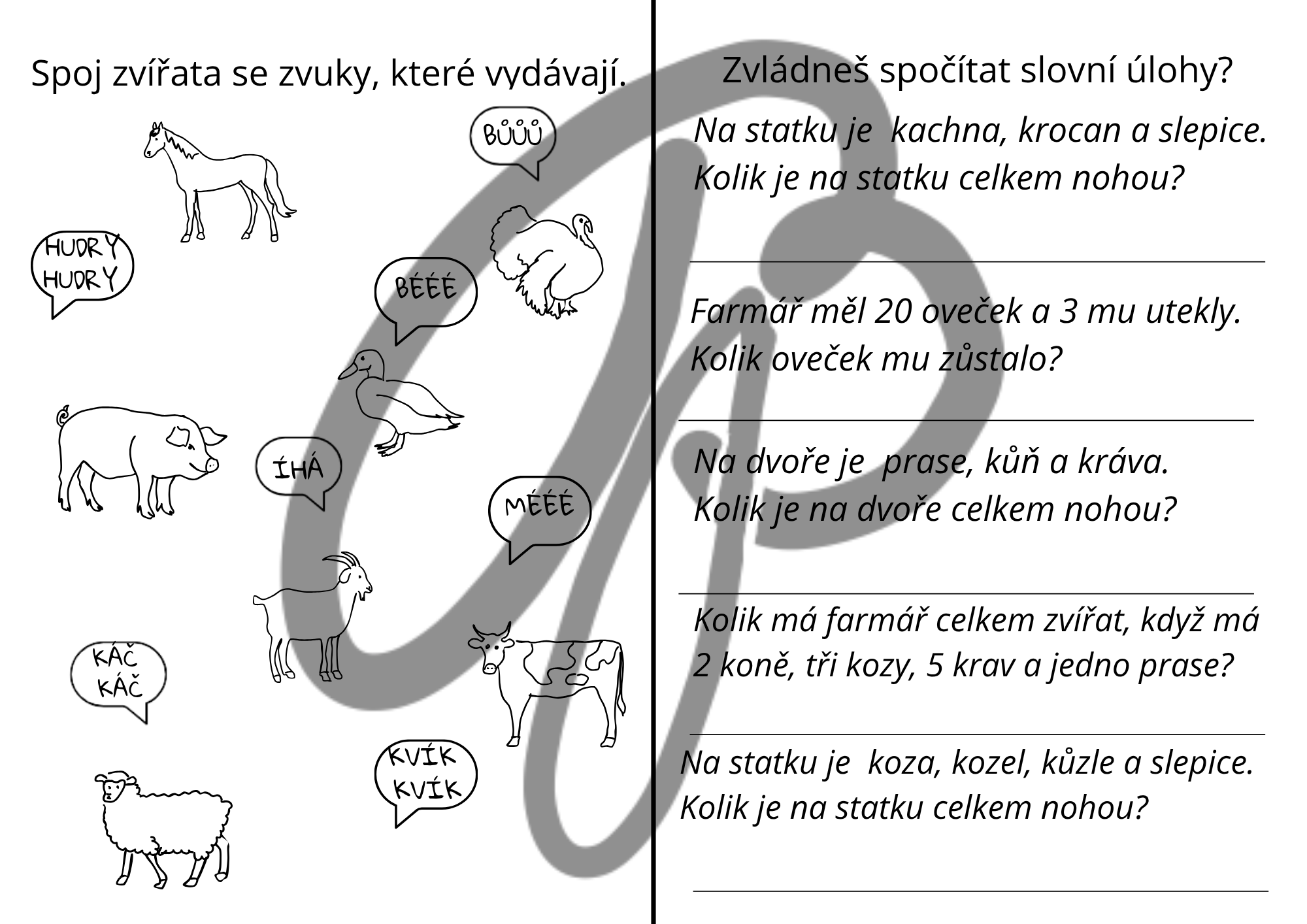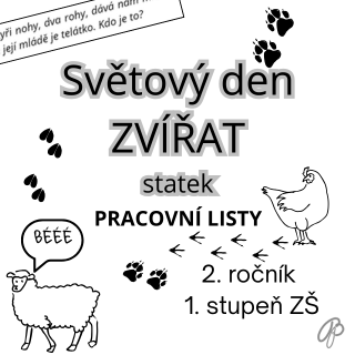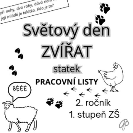 Černobílý oboustranný tisk. Světový den zvířat - zaměřeno na statek. Materiál je určen především pro žáky 2. ročníku ZŠ. Obsahuje hádanky, přiřazování zvuků, jednoduché slovní úlohy, práci s abecedou, poznávání zvířat podle popisu či stop a doplňování lidové písně. Úkoly rozvíjejí čtení, logické myšlení, matematické dovednosti i vztah k přírodě.