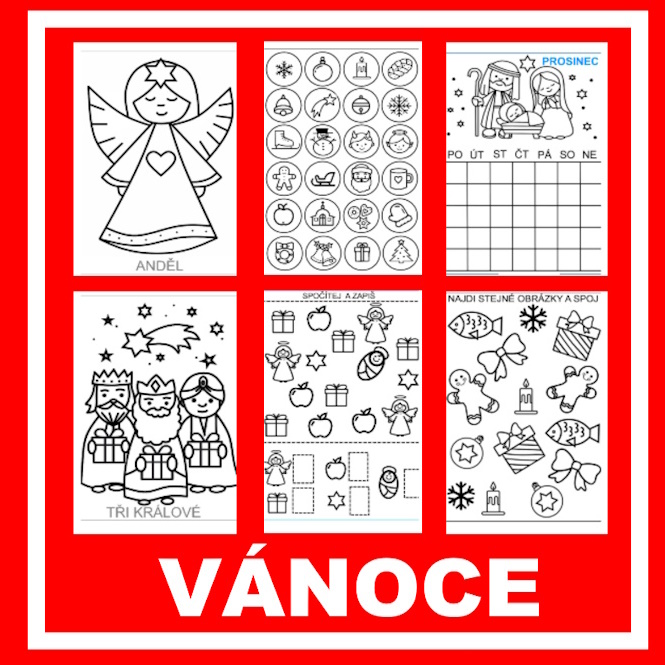 Adventní kalendář, omalovánky, obtahovačky, jednoduché počítání, čtení a psaní, vyprávění o Ježíškovi, ukazovací básnička o Ježíškovi, obrázky - jak se peče perníček, skládanky, vánoční obrázkové pexeso, hrátky se slovy a písmenky, spojovačky, tajenky a vystřihovánka. Vše vánoční tématika.