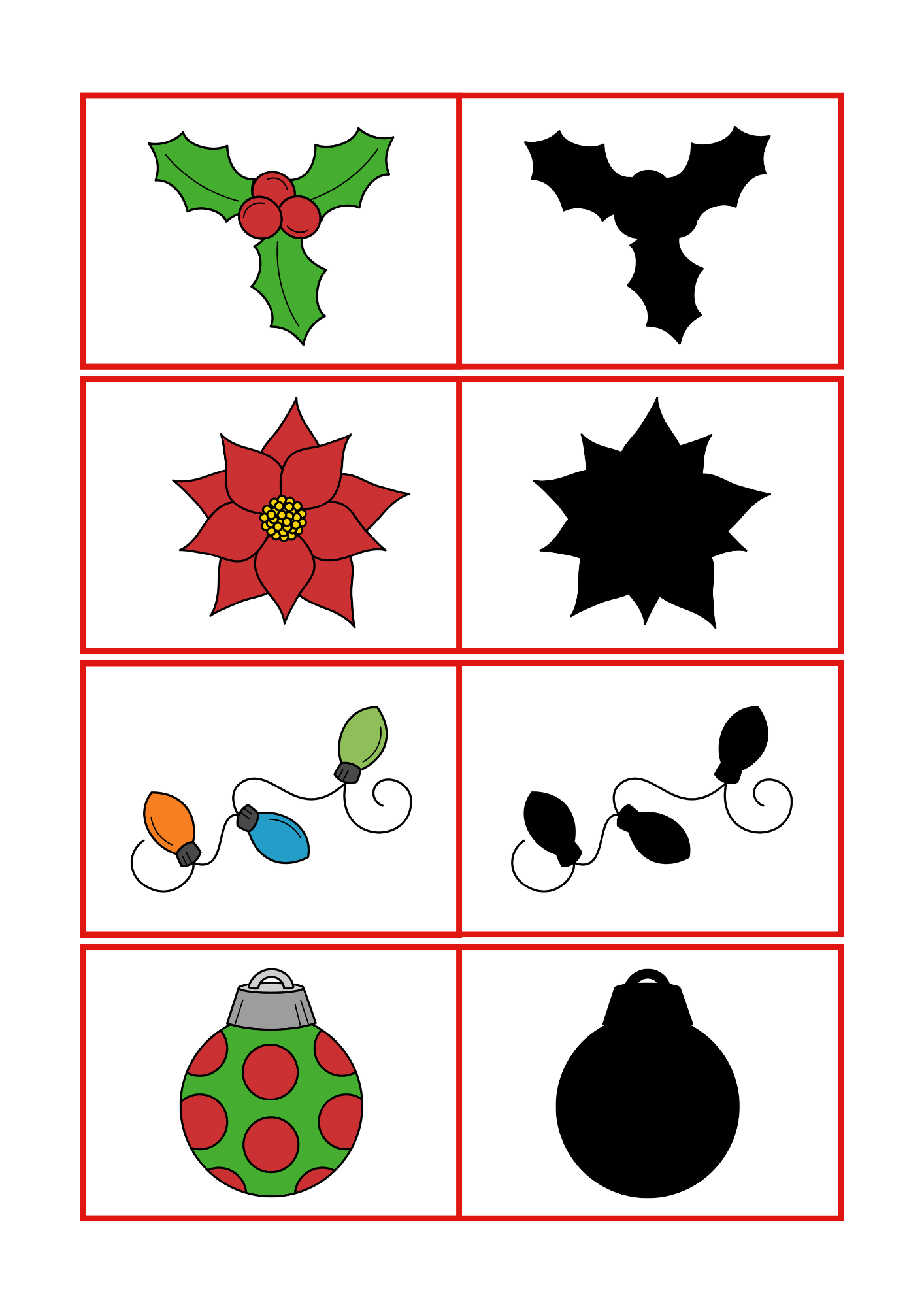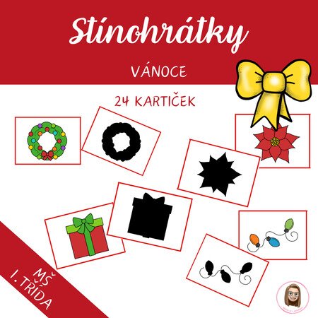 Vánoční stínohrátky jsou souborem 12 dvojic obrázků a jejich stínů. Materiál je vhodný pro děti v mateřské škole i na 1. třídy ZŠ. Děti porovnávají tvary, hledají shody, rozlišují kontury a učí se pojmenovávat vánoční předměty. Kartičky lze využít jako aktivitu na rozvoj zrakového vnímání, pexeso nebo třídicí úkol na barevné obrázky a jejich stíny.
