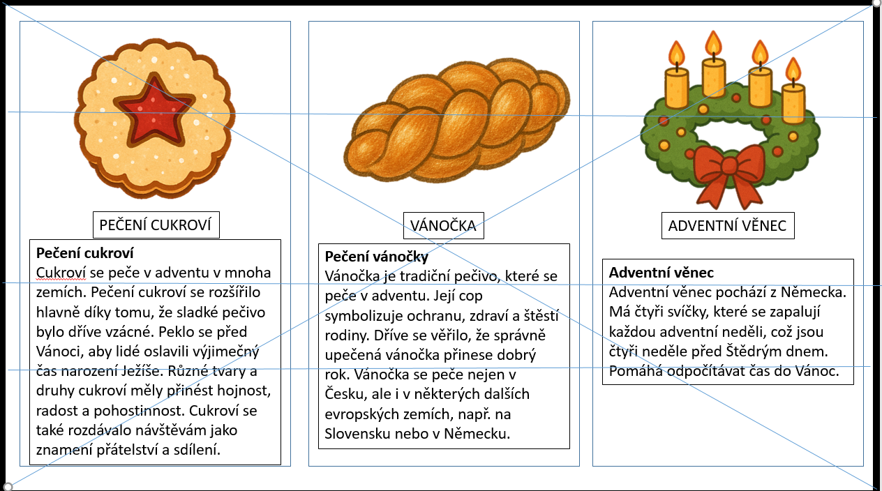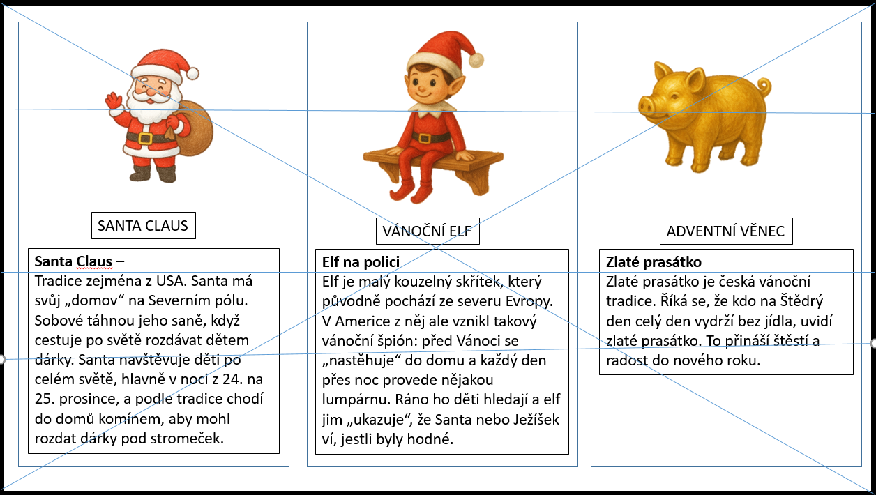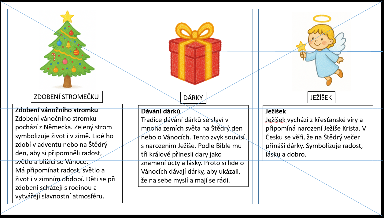 Cíl: Seznámit děti s vánočními tradicemi doma i v zahraničí, podporovat pozornost, slovní zásobu, paměť, komunikaci a sociální dovednosti.