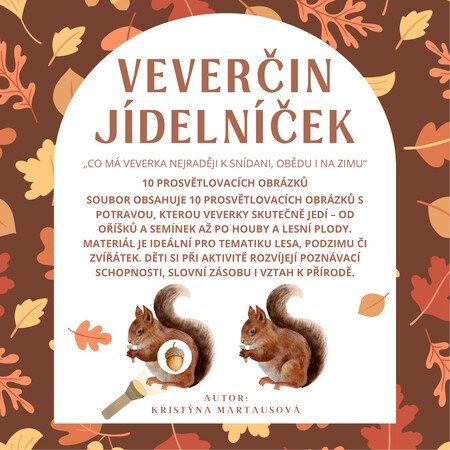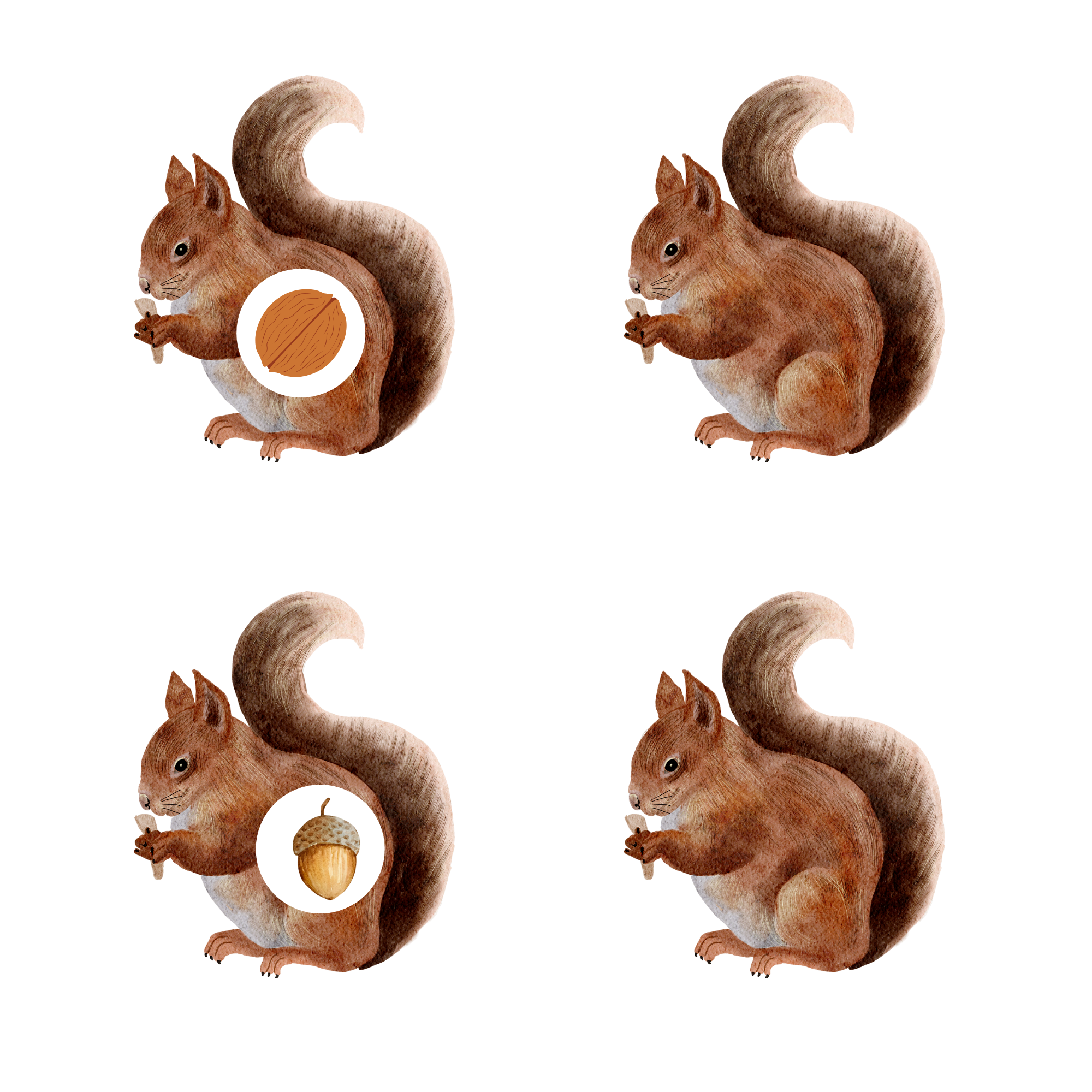 Vytiskněte si dvojici obrázků – vždy dvě stejné veverky: jednu s obrázkem potravy a jednu bez.