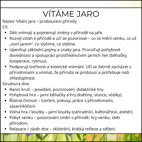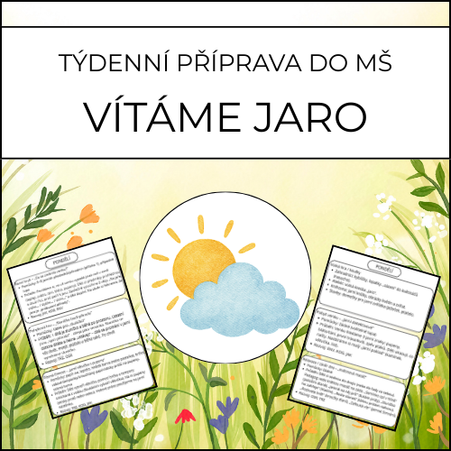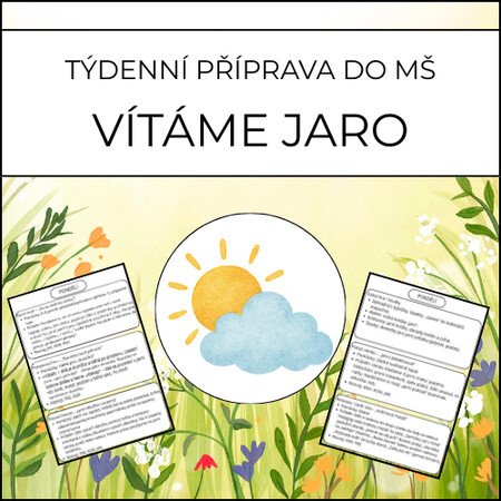 Týdenní tematická příprava „Vítáme jaro“ vede děti k tomu, aby jaro opravdu prožily – ne jen „věděly, že je jaro“, ale aby ho viděly, slyšely, zkoumaly, pojmenovávaly a objevovaly v běžném dni. Děti si v průběhu týdne všímají proměn v přírodě, jarního počasí, květin i semínek a učí se o jaru mluvit přirozeně a s radostí. Týden je plný smysluplných aktivit: jarní hry, pokusy, tvoření, pohybové aktivity, smyslové činnosti, práce s přírodninami, čtenářská pregramotnost a rozbor pohádky. Nechybí oblíbené aktivity jako papírové květy ve vodě, sázení semínka, „Jak voní jaro?“, jarní stínové pexeso nebo tvoření ptačích hnízd.