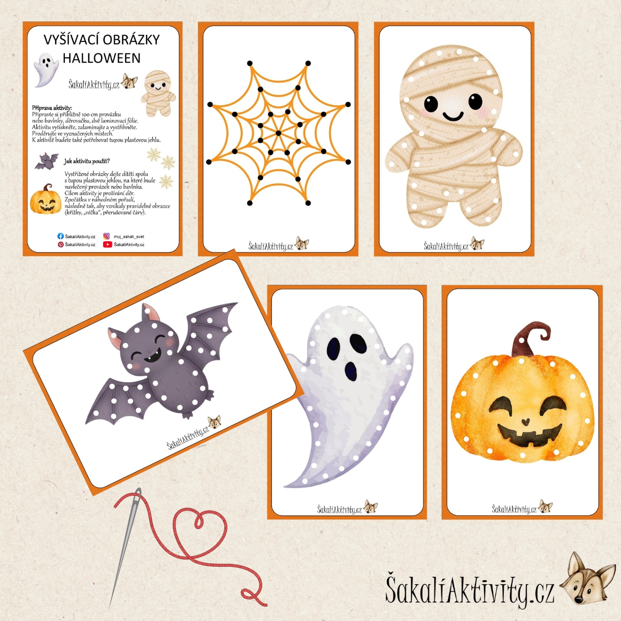 🧵 Vyšívací obrázky – Halloween jsou kreativní PDF aktivity pro děti, které rozvíjejí jemnou motoriku, trpělivost a koordinaci oka a ruky. Tento soubor obsahuje 5 halloweenských motivů ve formátu A5 – duch, dýně, mumie, pavučina a netopýr. Každý obrázek má vyznačená místa pro proděrování, díky nimž si děti mohou procvičit základní dovednosti šití a prošití zábavnou formou.