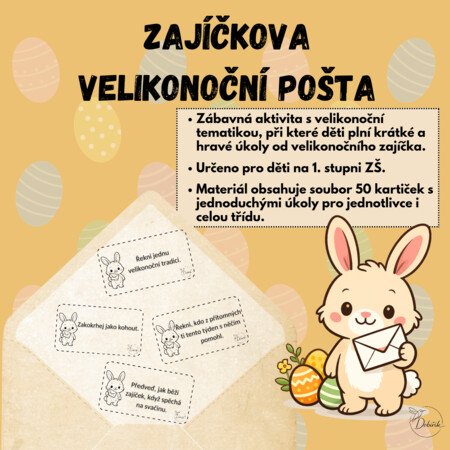 Materiál je určen pro děti na 1. stupni ZŠ. Jedná se o krátkou hravou aktivitu s názvem ZAJÍČKOVA VELIKONOČNÍ POŠTA, při které děti plní jednoduché a zábavné úkoly od velikonočního zajíčka. Úkoly jsou nenáročné, slouží především k pobavení dětí, uvolnění atmosféry a radosti ze společné činnosti. Zároveň podporují spolupráci, vzájemnou ohleduplnost a pomáhají utužovat třídní kolektiv. Aktivita přirozeně navozuje jarní a velikonoční atmosféru a je vhodná jako krátké zpestření výuky nebo na závěr hodiny.