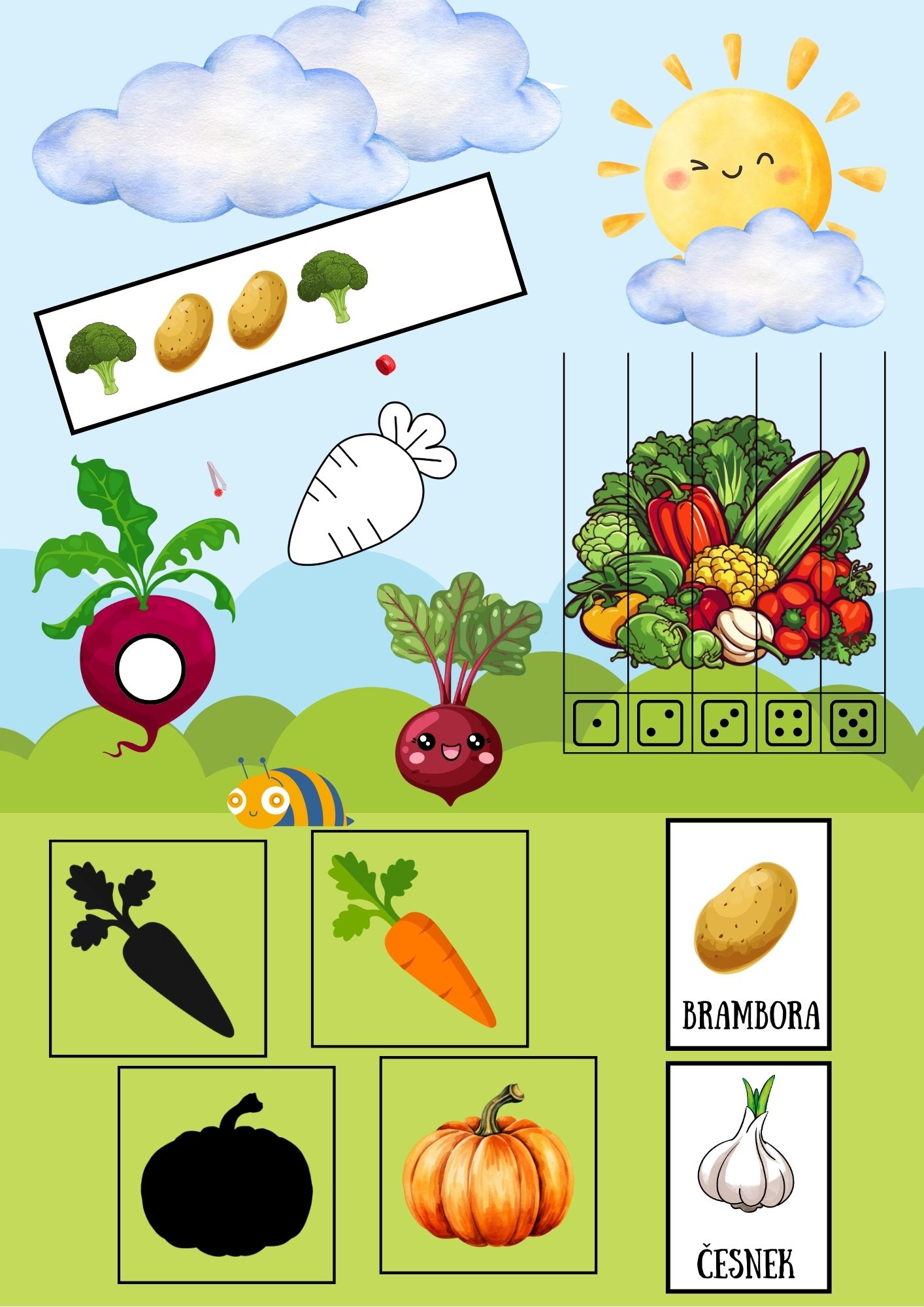Tento soubor nabízí pestrou škálu vzdělávacích a hravých aktivit zaměřených na téma ZELENINA. Obsahuje pohádku s možností dramatizace pomocí loutek, demonstrační kartičky, cvičení na doplňování řad, kartičky k využití s robotickou včelkou Beebot (obrázek + jeho stín), víčkohrátky, omalovánky, puzzle a senzomotorickou hru (hledánízeleniny v písku/mouce). Součástí jsou také aktivity zaměřené na jemnou motoriku.