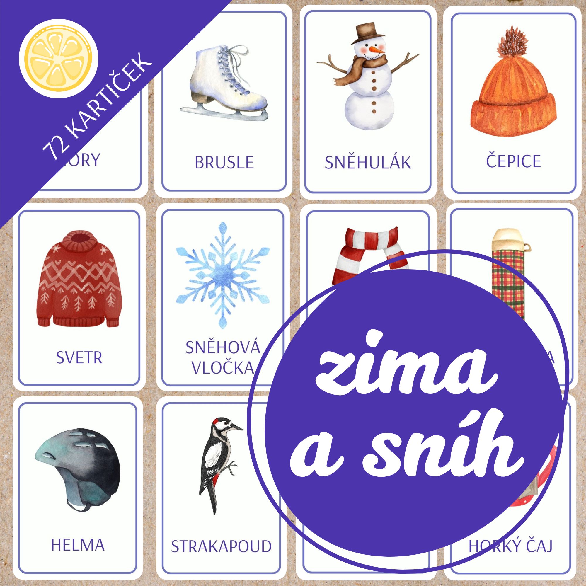 ❄️ Součástí sady je 72 kartiček a 4 doplňkové obrázky. Zobrazená témata: sníh, zima, zimní sporty a radovánky (lyžování, bruslení, koulování...), zimní krajina, svátek sv. Martina, oblečení, jídlo, zimní ptáčci a zimní zvířata.
