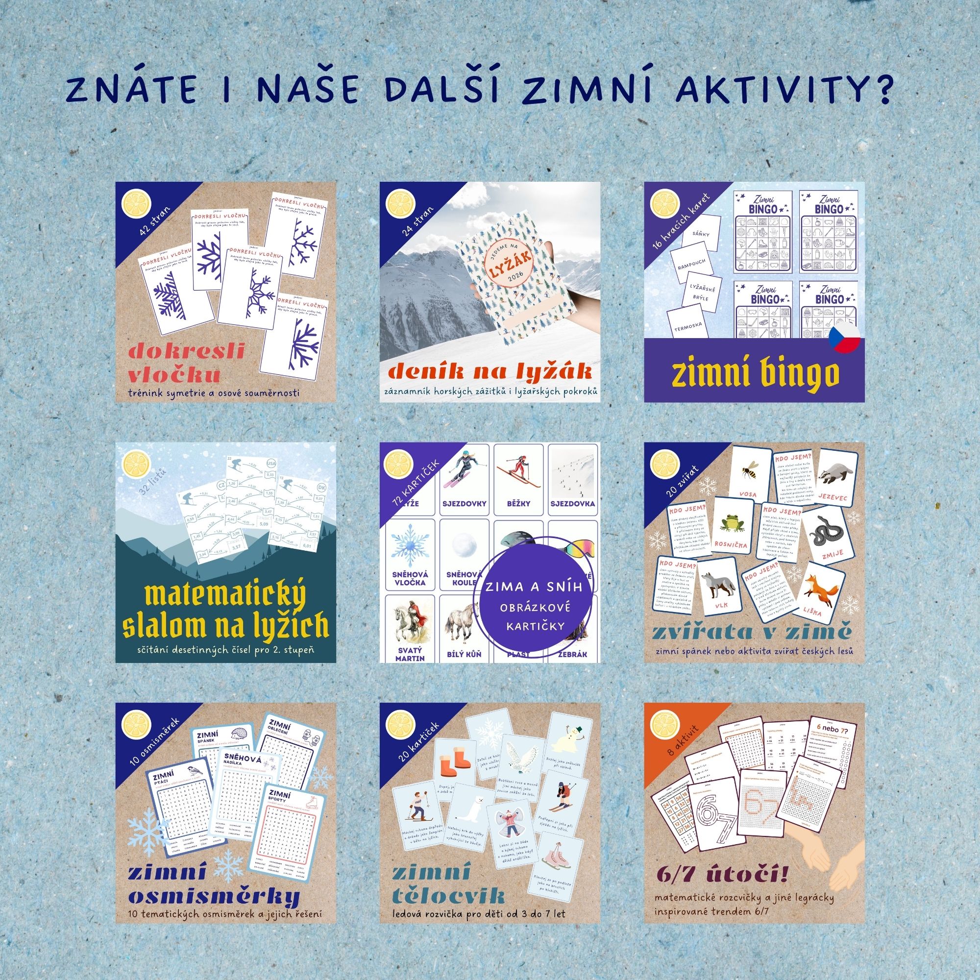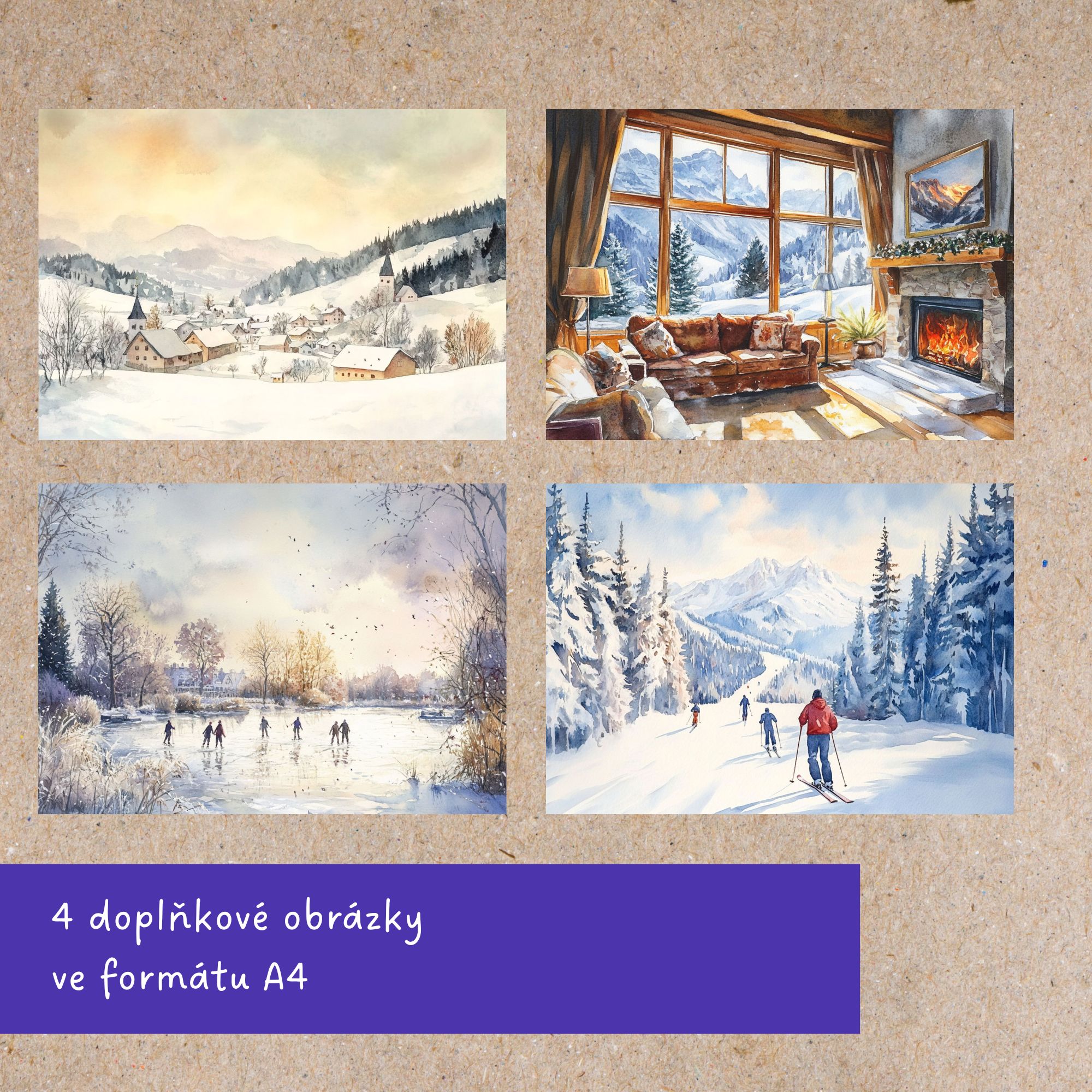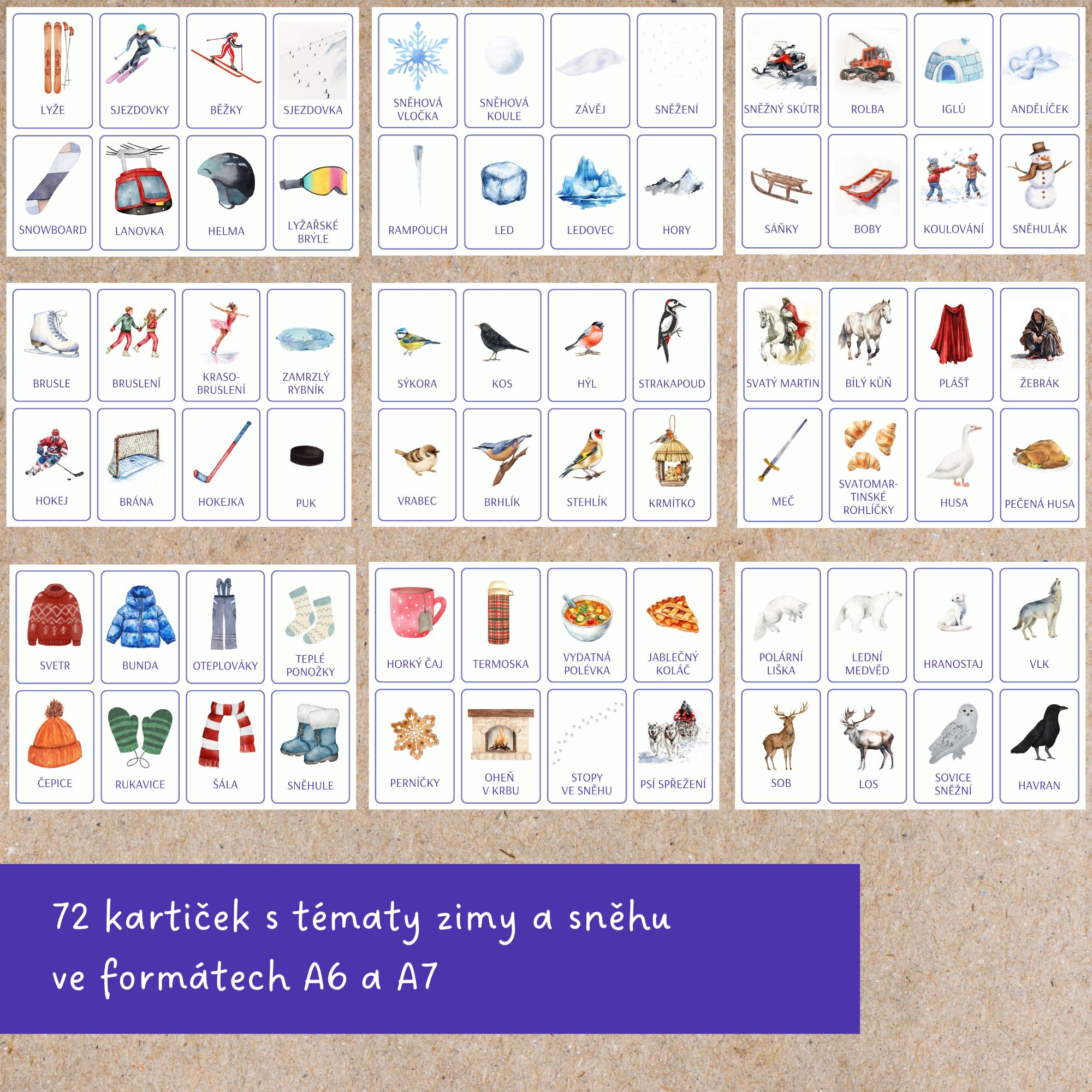 ❄️Sada 72 kartiček ve velikostech A6 a A7 s obrázky všeho, co souvisí se zimou: zimních sportů, aktivit, oblečení, ptáčků nebo zvířat.