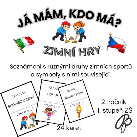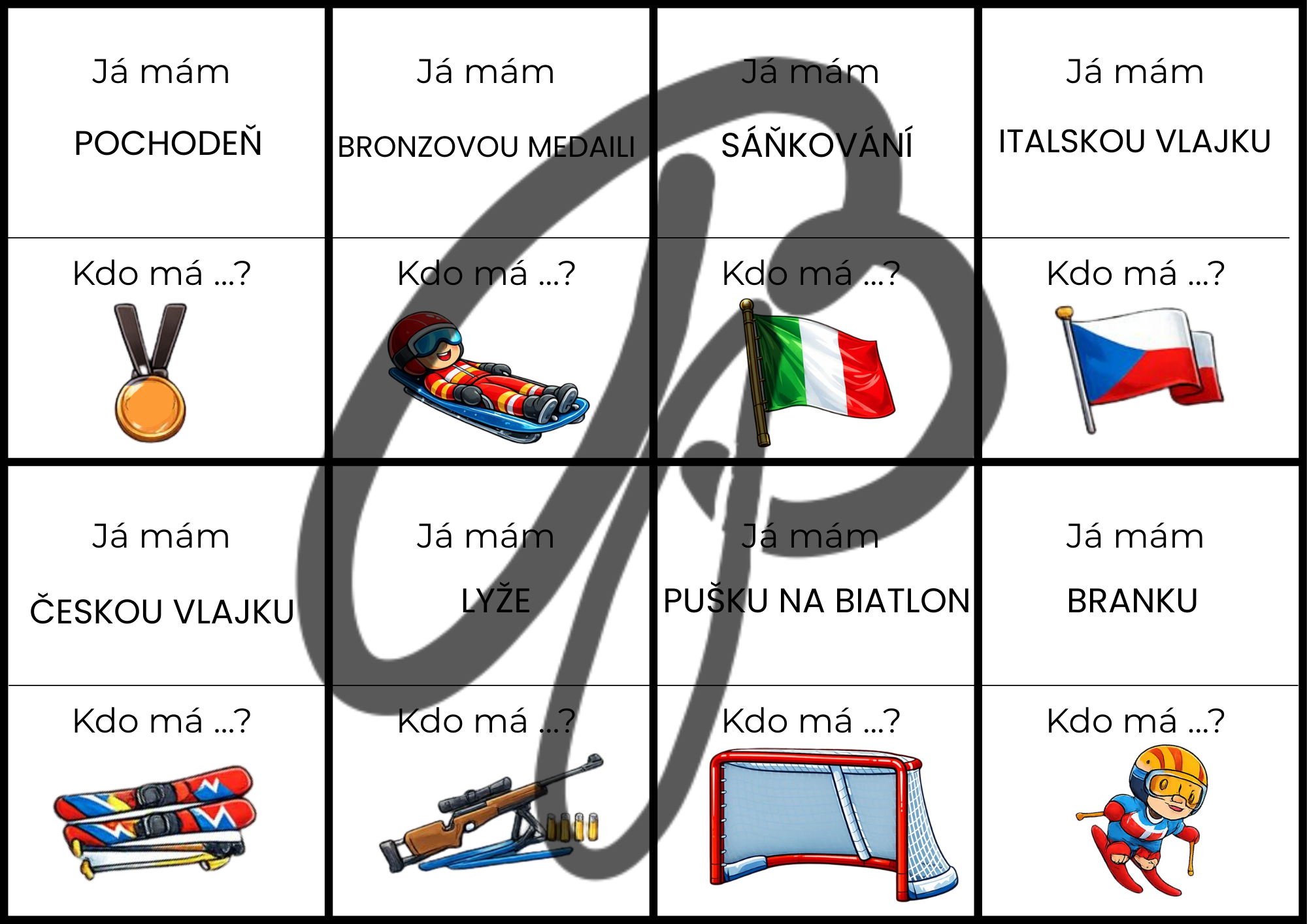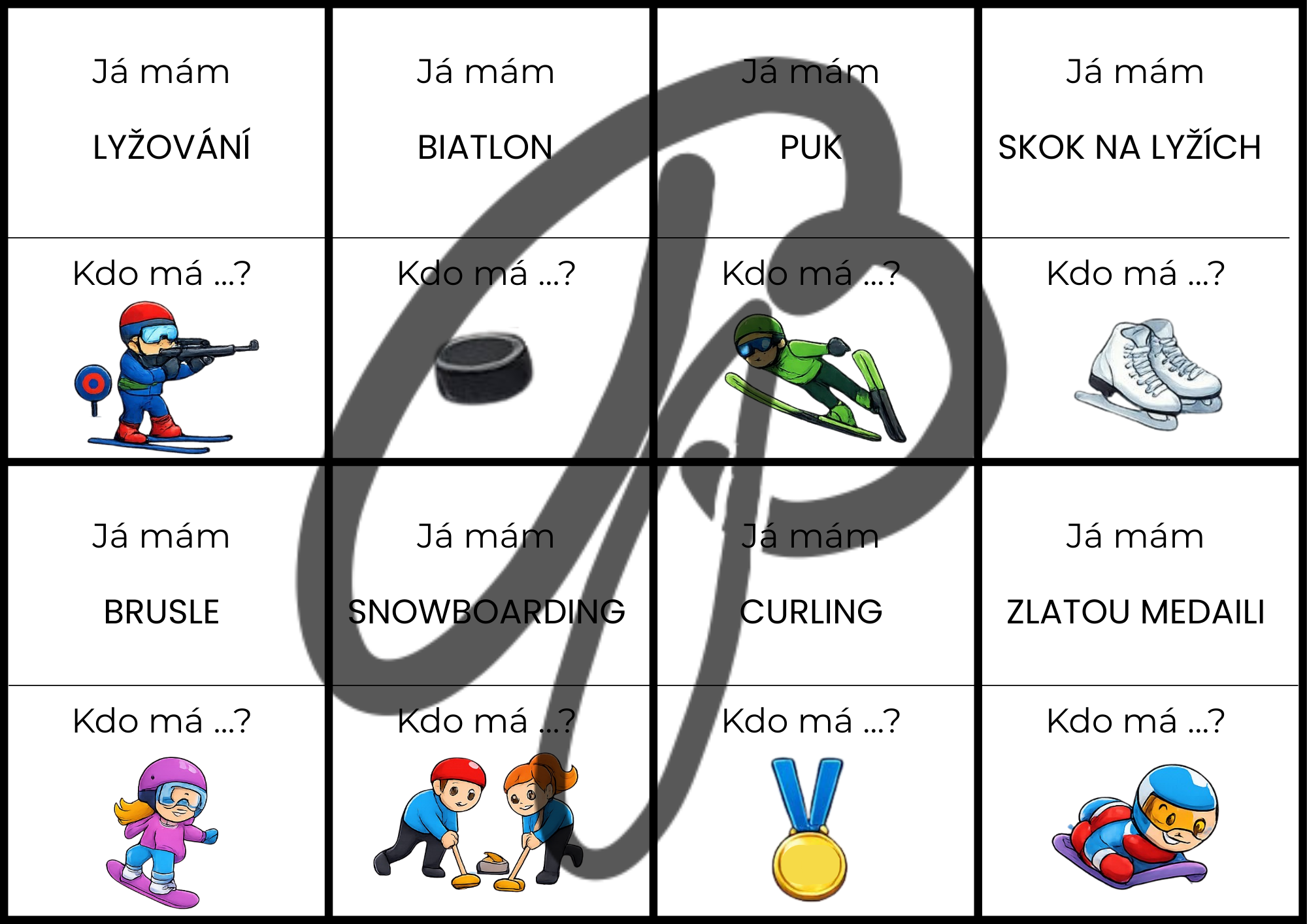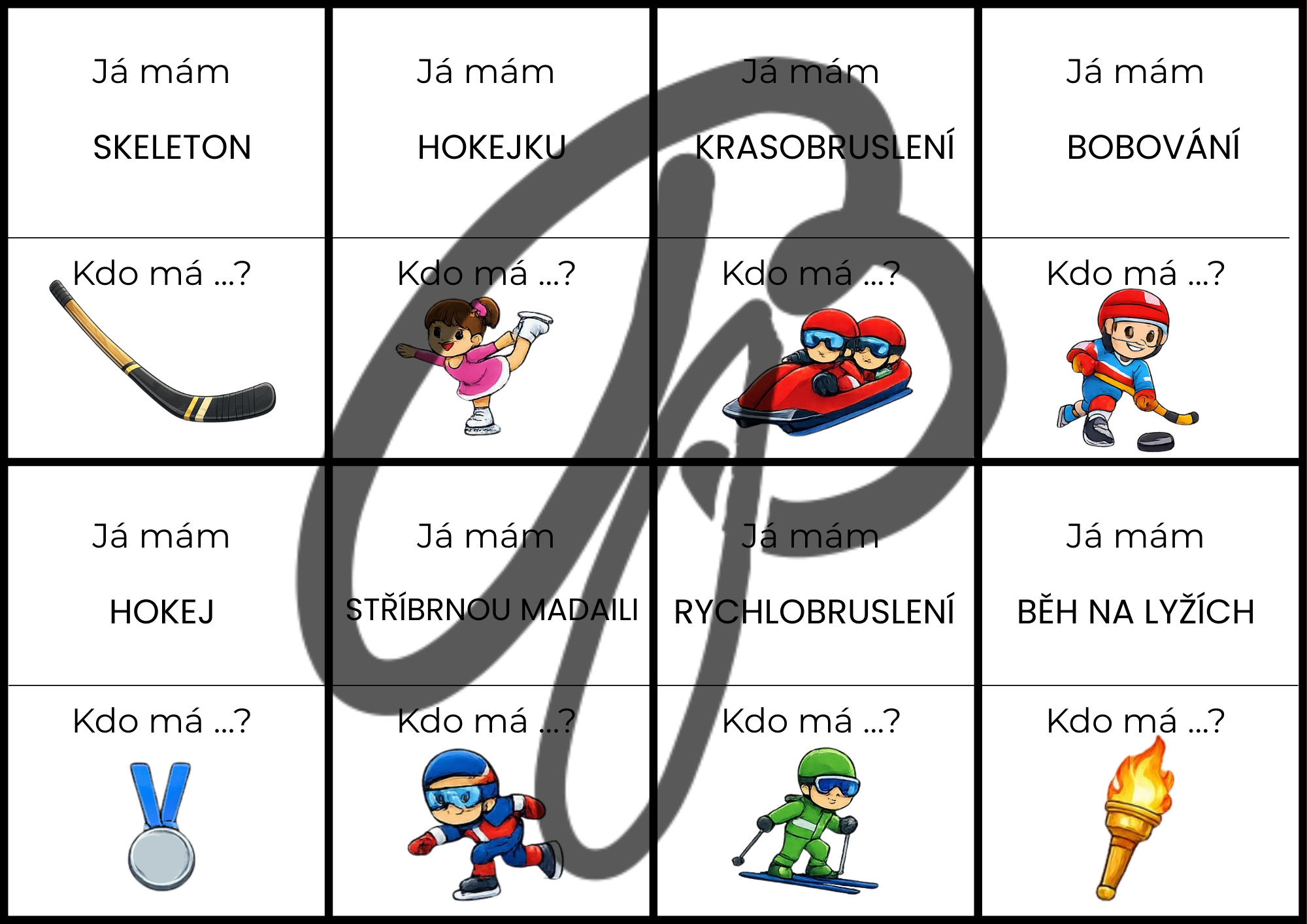 Rozvíjíme zejména pozornost a soustředění, slovní zásobu a vyjadřovací schopnosti. Každý žák dostane právě jednu kartičku, které jsou rozdány náhodně. Učitel, nebo vybraný žák, začne čtením své karty ,,Já mám ..., kdo má ...?” Žák, který má správnou odpověď, přečte svou kartičku. Hra nemá vítěze, cílem je navázat na sebe všechny karty.
