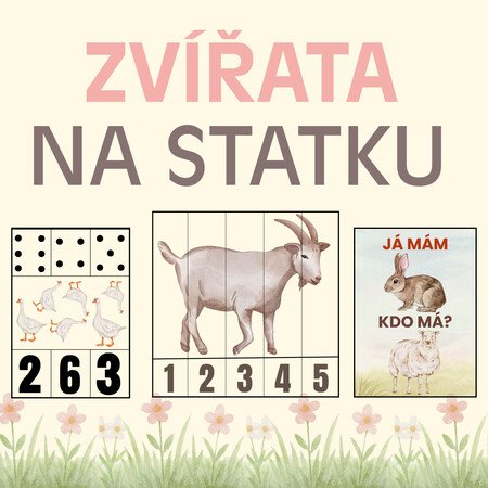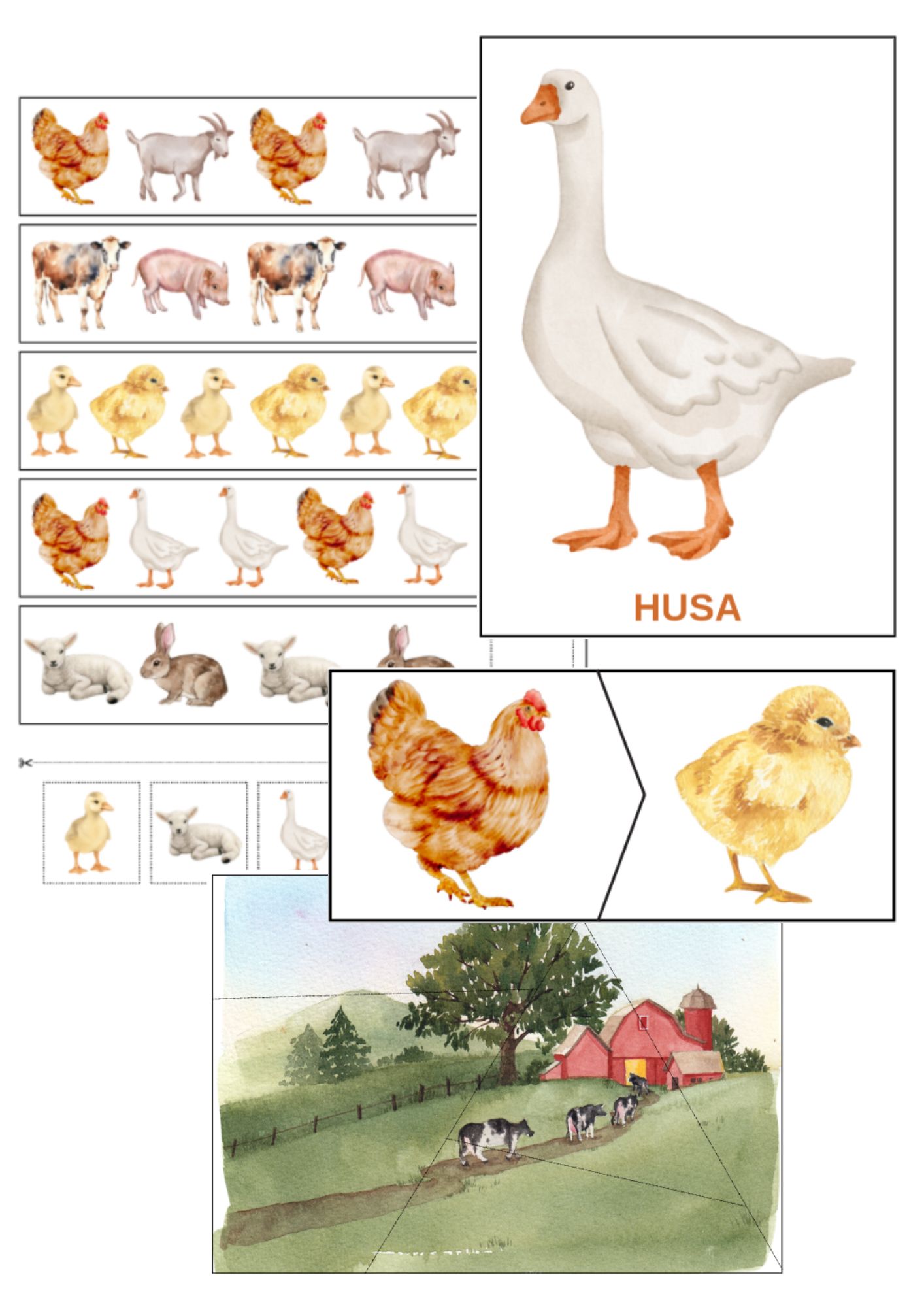 🔹 16 demonstračních obrázků hospodářských zvířat (vždy dospělý jedinec a mládě),