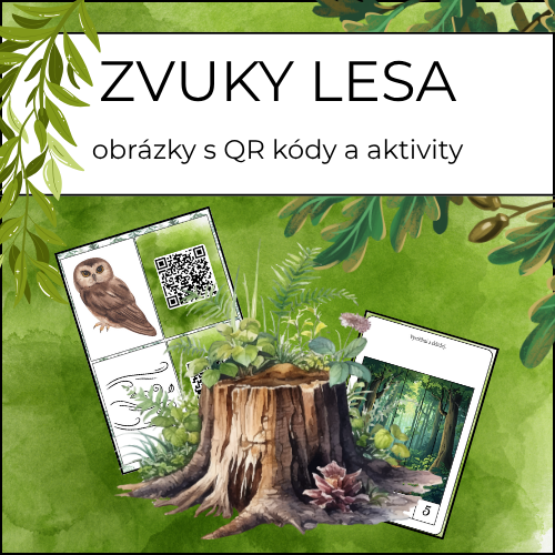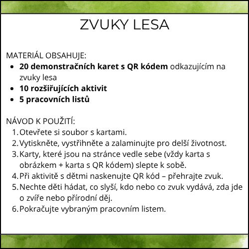 Sada obsahuje demonstrační karty se zvuky lesa – na jedné straně realistický obrázek, na druhé QR kód, který po naskenování přehraje autentický zvuk z přírody.