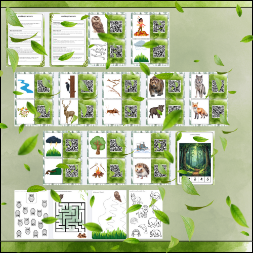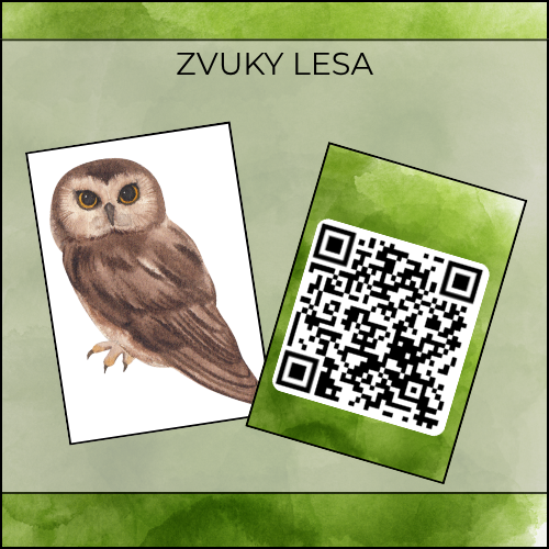 (např. divoké prase, vlk, liška, prasknutí větve, bouřka, kroky ve sněhu, pád stromu…) - každá karta = realistický obrázek + QR kód odkazující na zvuk