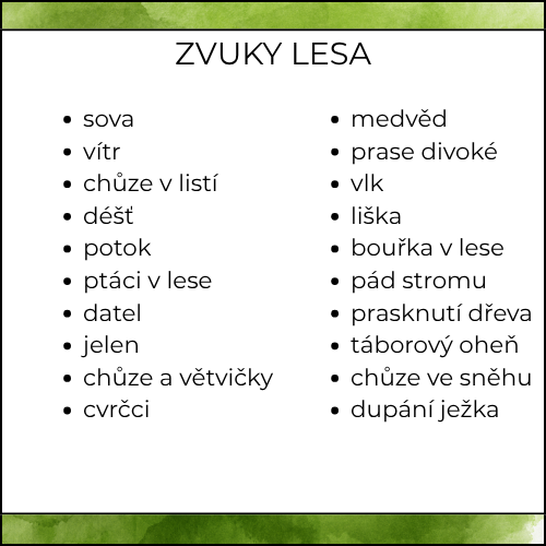 - Na závěr si děti mohou vypracovat pracovní list – např. přiřazování zvuku k obrázku, obtahování symbolů, doplňování nebo tvoření „mapy lesa“.