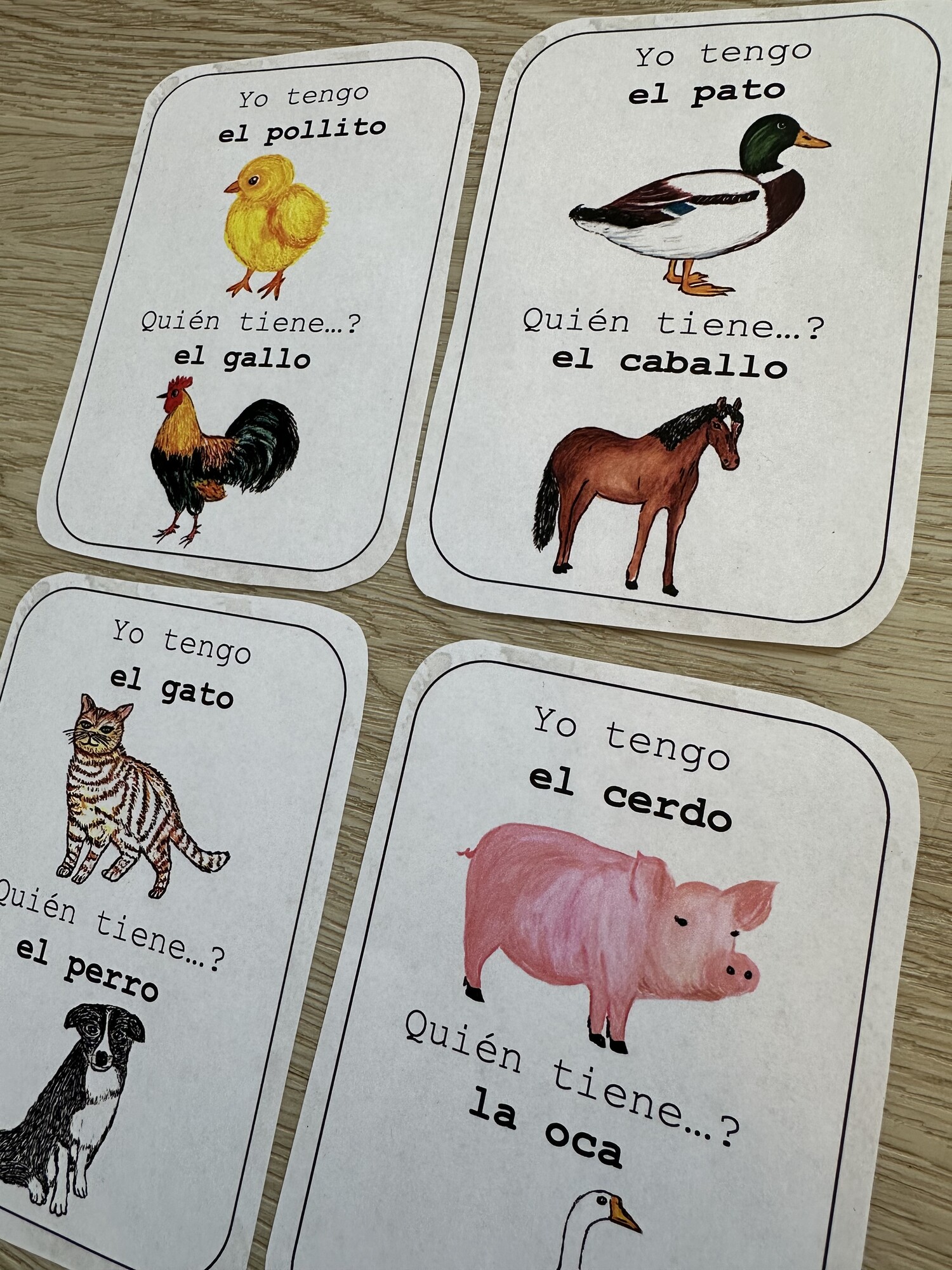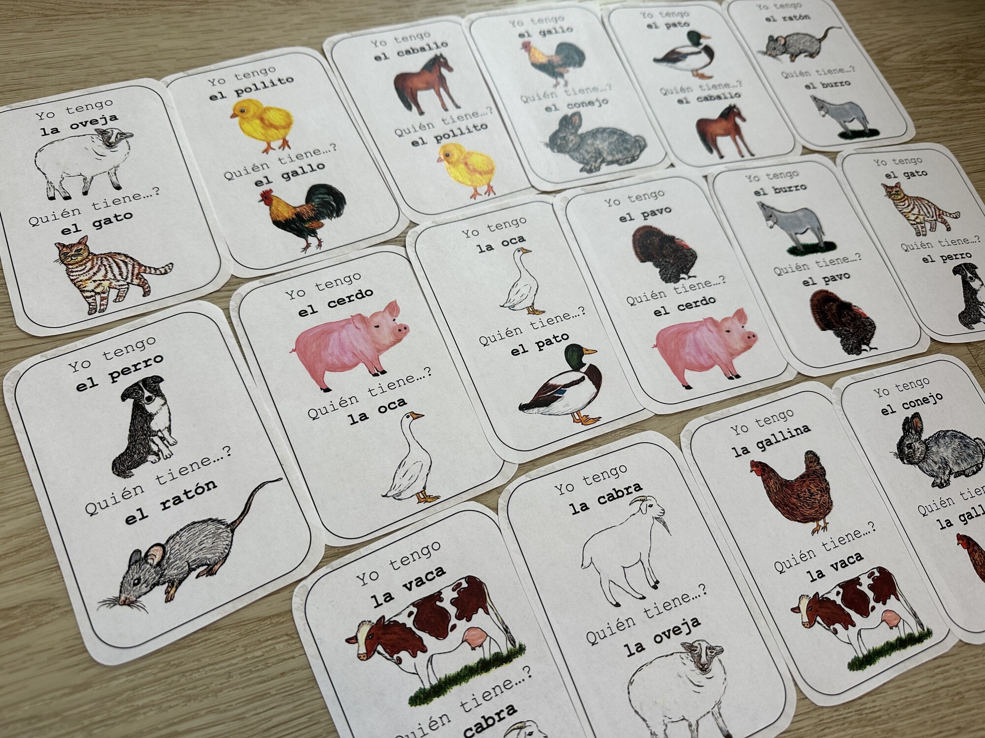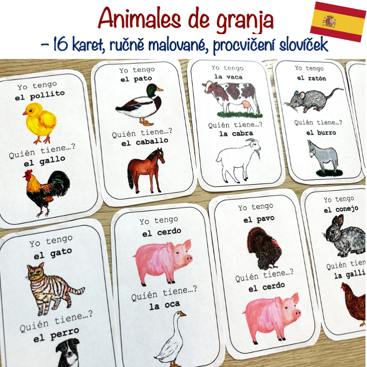 Materiál obsahuje 4 A4 stran hry Yo tengo, quién tiene? – 16 karet s ručně malovanými obrázky na téma animales de granja - zvířata z farmy. Procvičení slovíček, čtení, postřehu.