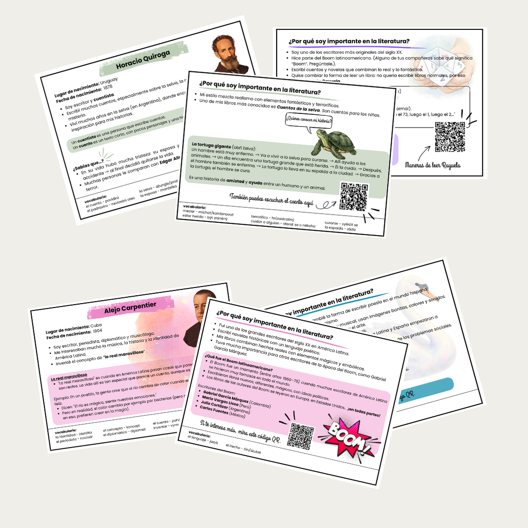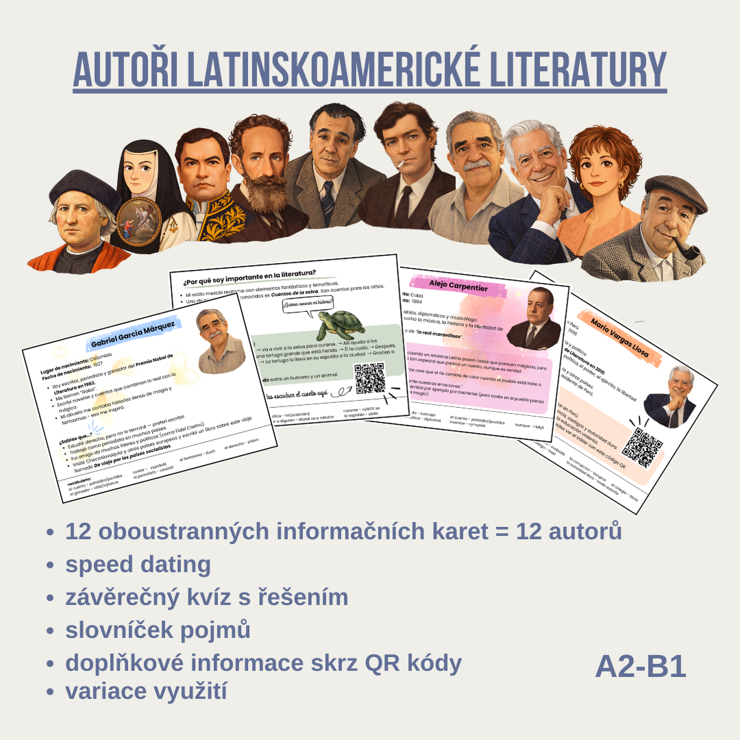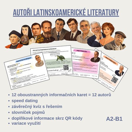 Tento výukový materiál představuje 12 medailonků autorů latinskoamerické literatury. Medailonky mají formu oboustranných karet napsaných v první osobě, jako by autorem byl sám spisovatel. Každá karta obsahuje základní informace o životě a díle autora, zajímavosti, slovníček a sekci „Proč jsem důležitý/á pro literaturu“.