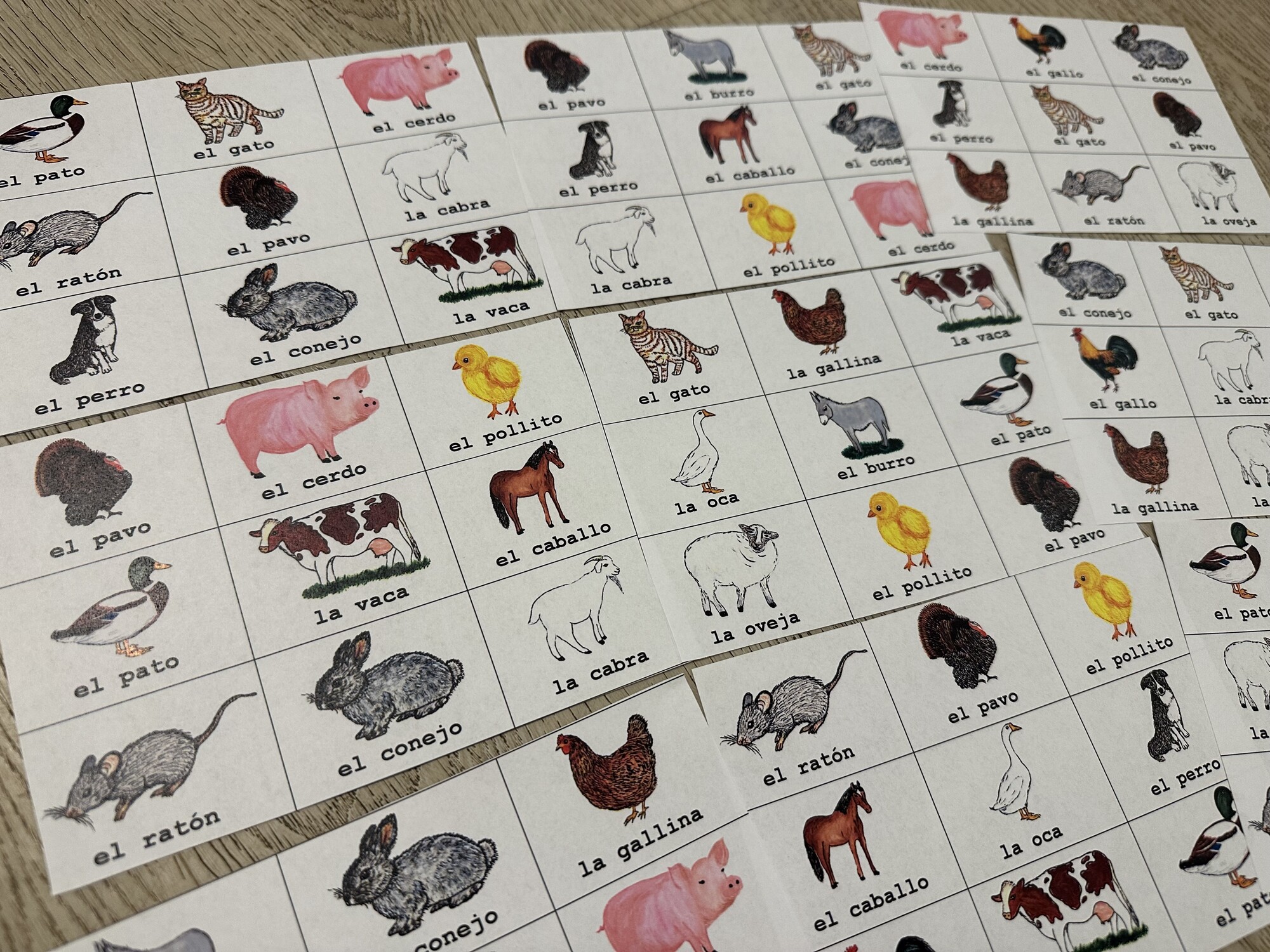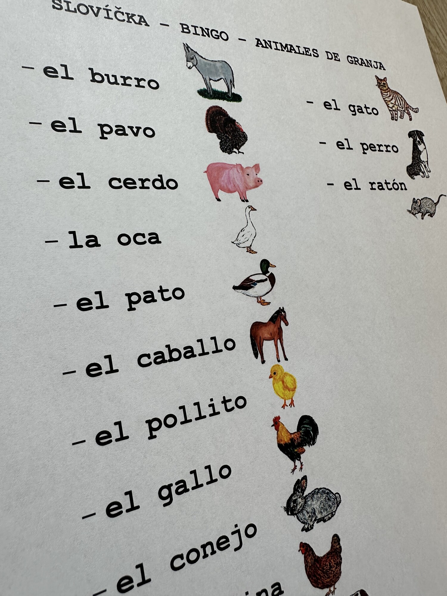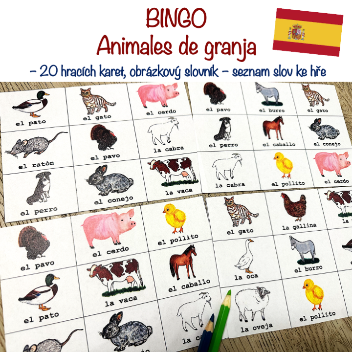 Materiál se skládá z 10 A4 stran hry bingo (každá strana obsahuje dvě hrací karty) a ze slovníčku/seznamu slov ke hře. Hravé procvičení slovíček na téma los animales. Ručně malované obrázky.
