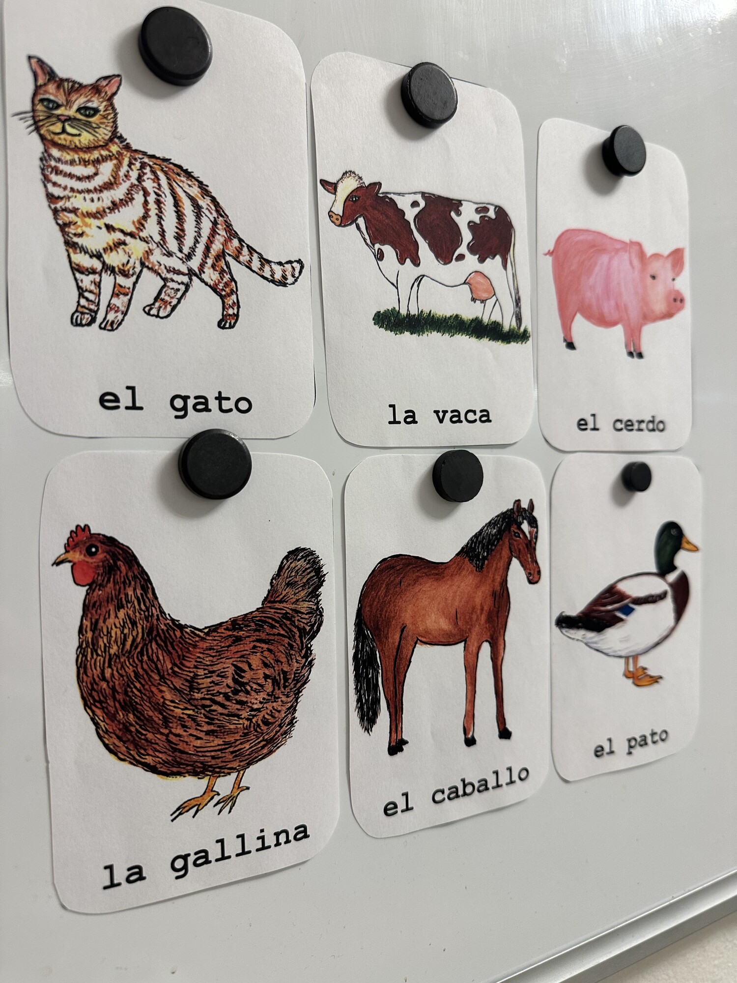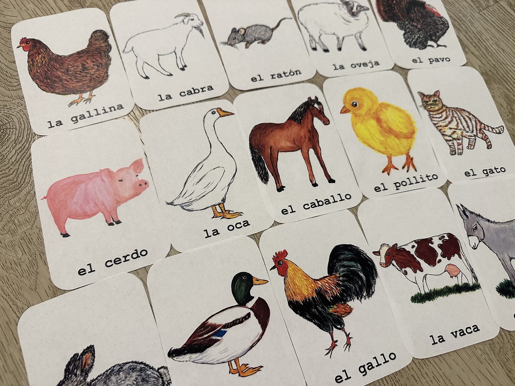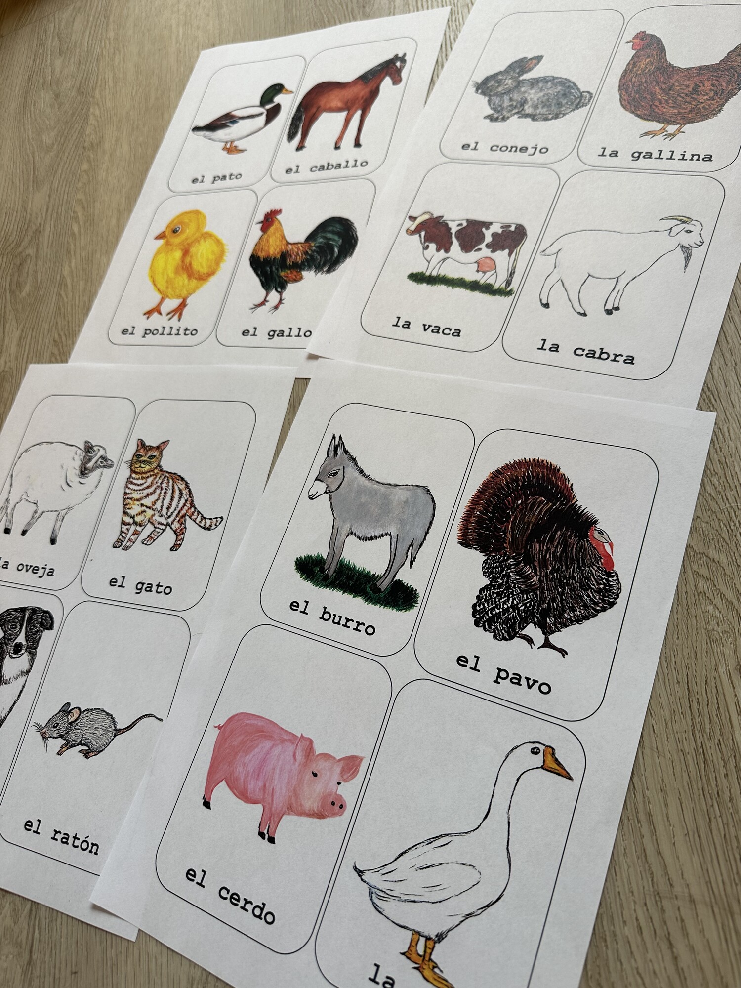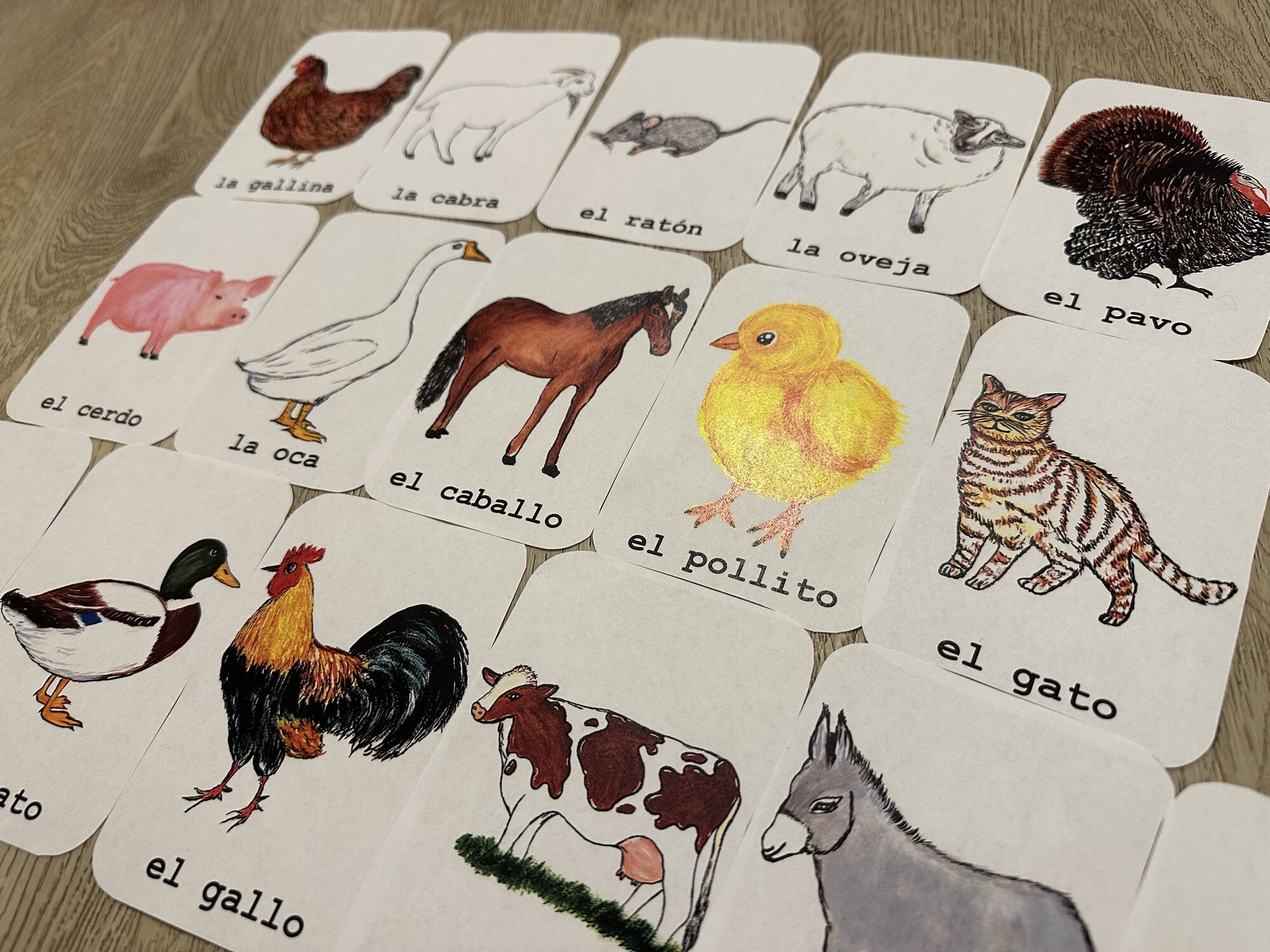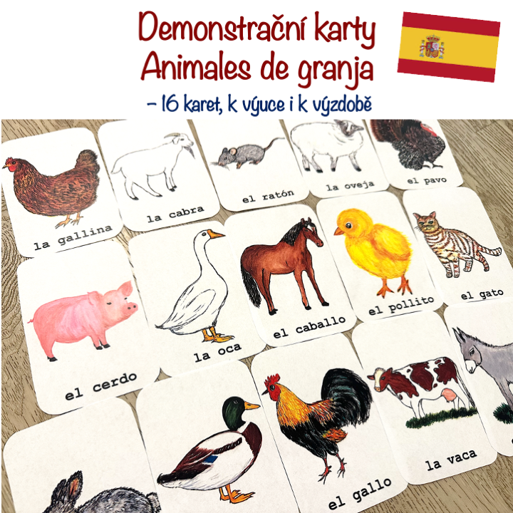 Materiál obsahuje 4 A4 strany – 16 A6 karet s ručně malovanými obrázky k tématu animales de granja. Vhodné k výuce i k výzdobě. Obsahuje tipy na aktivity s kartami.