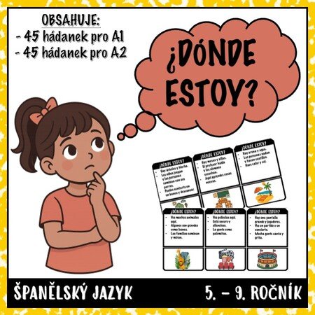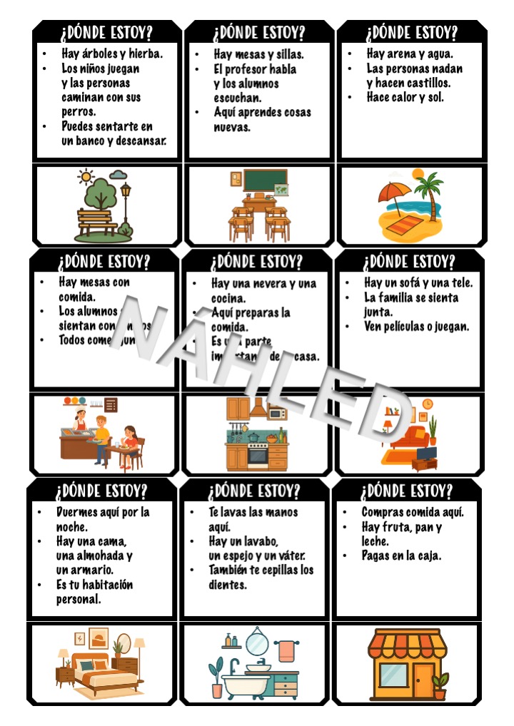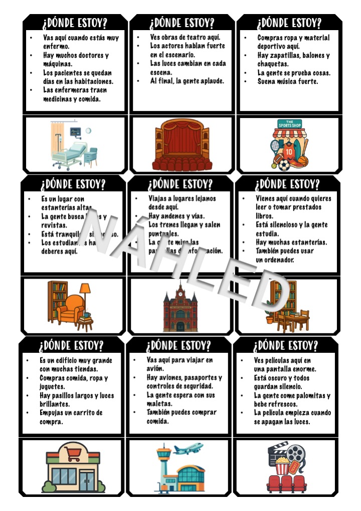 - Zábavná jazyková aktivita, při které žáci hádají místo podle popisu ve španělštině. Mohou přiřazovat obrázek nebo text. Každá kartička obsahuje několik vět, které popisují vzhled, funkci nebo využití prostředí ze školního nebo každodenního prostředí. Aktivita rozvíjí porozumění, slovní zásobu, schopnost logické dedukce a mluvení v anglickém jazyce. Kartičky lze využít při práci jednotlivců, ve dvojicích nebo ve skupině.