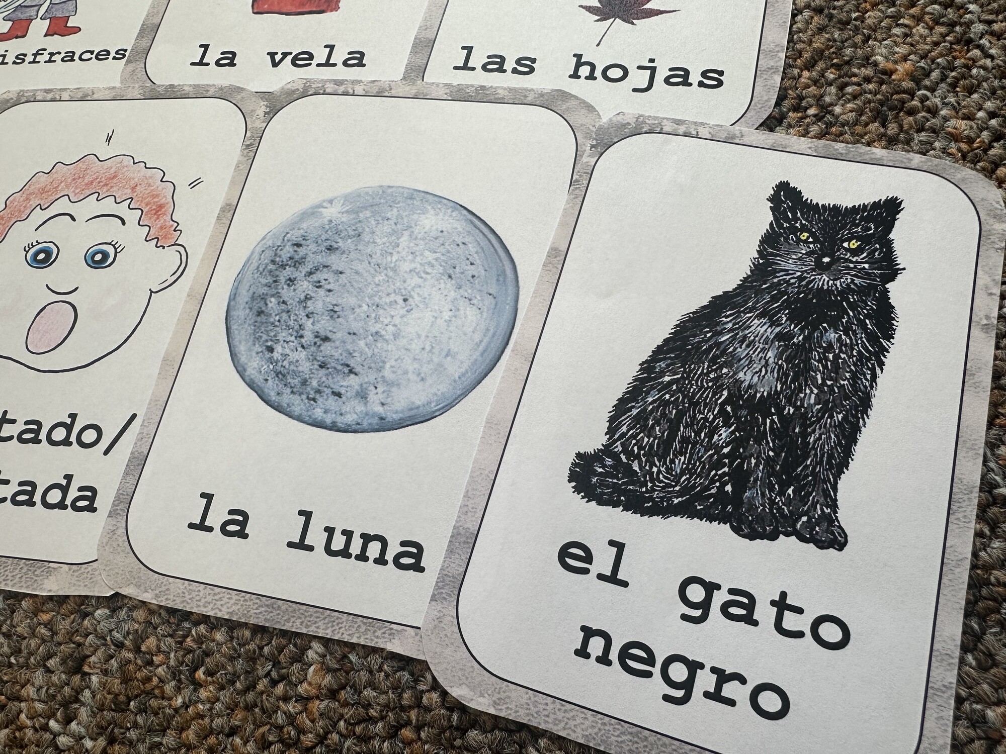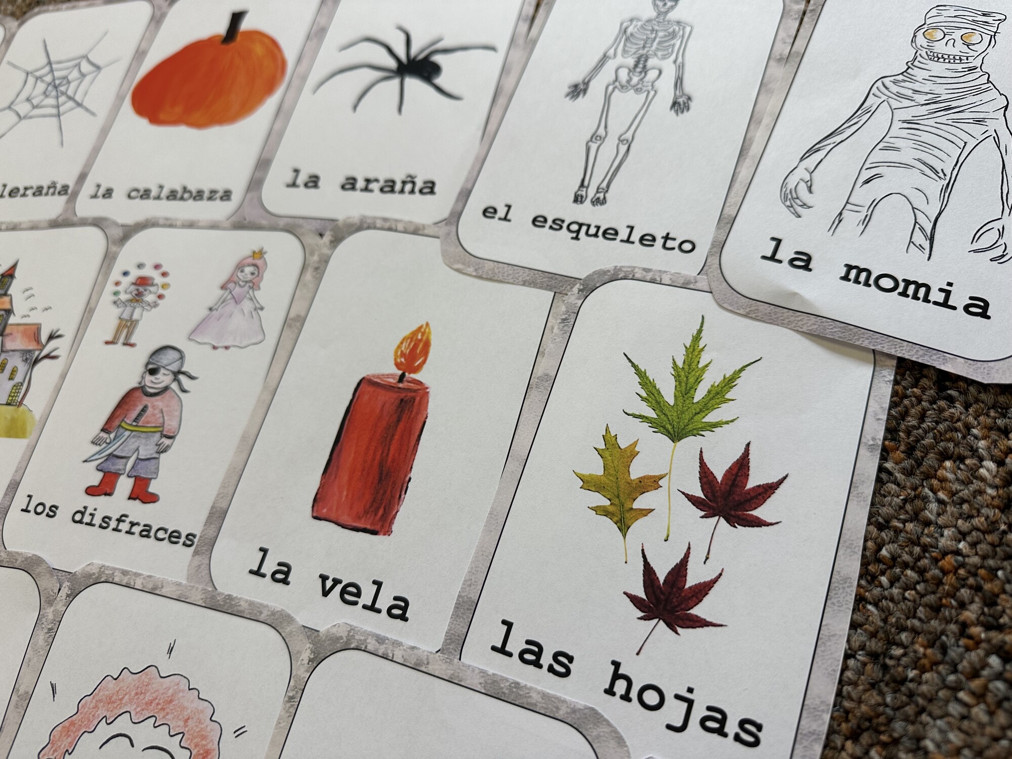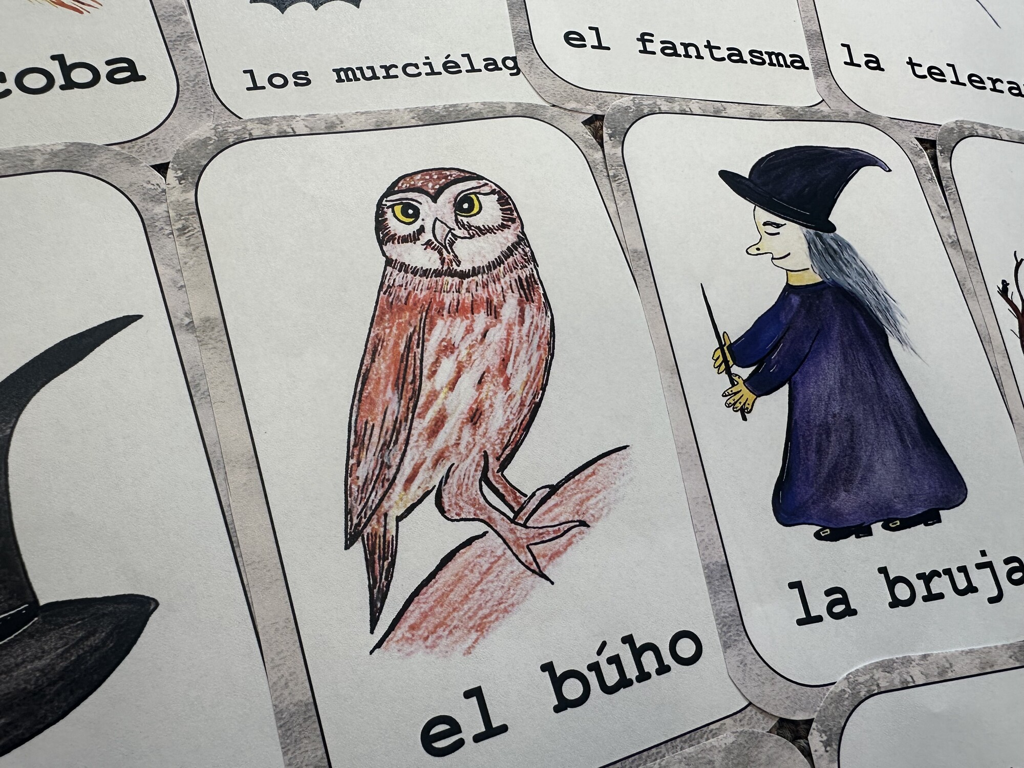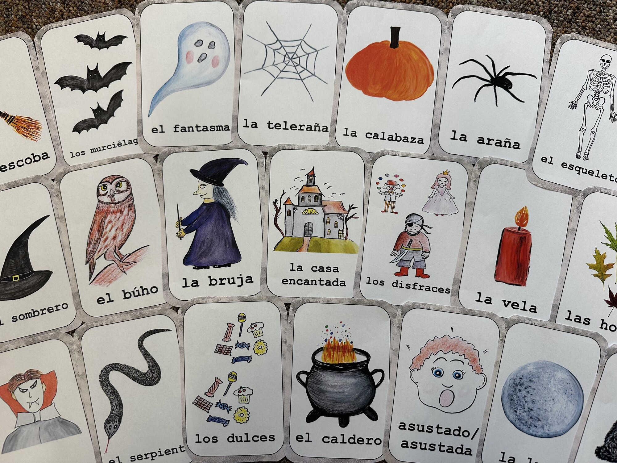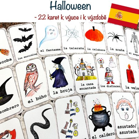 Materiál obsahuje 6 A4 stran – 22 karet velikosti A6. Ručně malované obrázky. Vhodné k výuce i k výzdobě. Procvičení španělských slovíček na téma Halloween. Děti si s kartami obohatí slovní zásobu. Můžete s dětmi karty třídit dle různých kritérií, hledat ke slovům rýmy, popisovat atd.