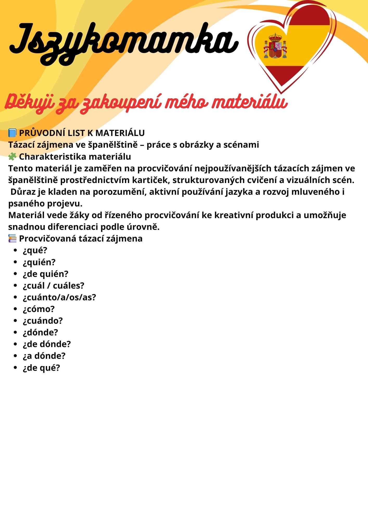 Materiál je zaměřen na procvičování nejpoužívanějších tázacích zájmen ve španělštině pomocí kartiček, pracovního listu a 6 vizuálních scén. Žáci pracují s otázkami typu quién, qué, dónde, cómo, cuánto, cuál, cuándo a popisují situace na obrázcích.