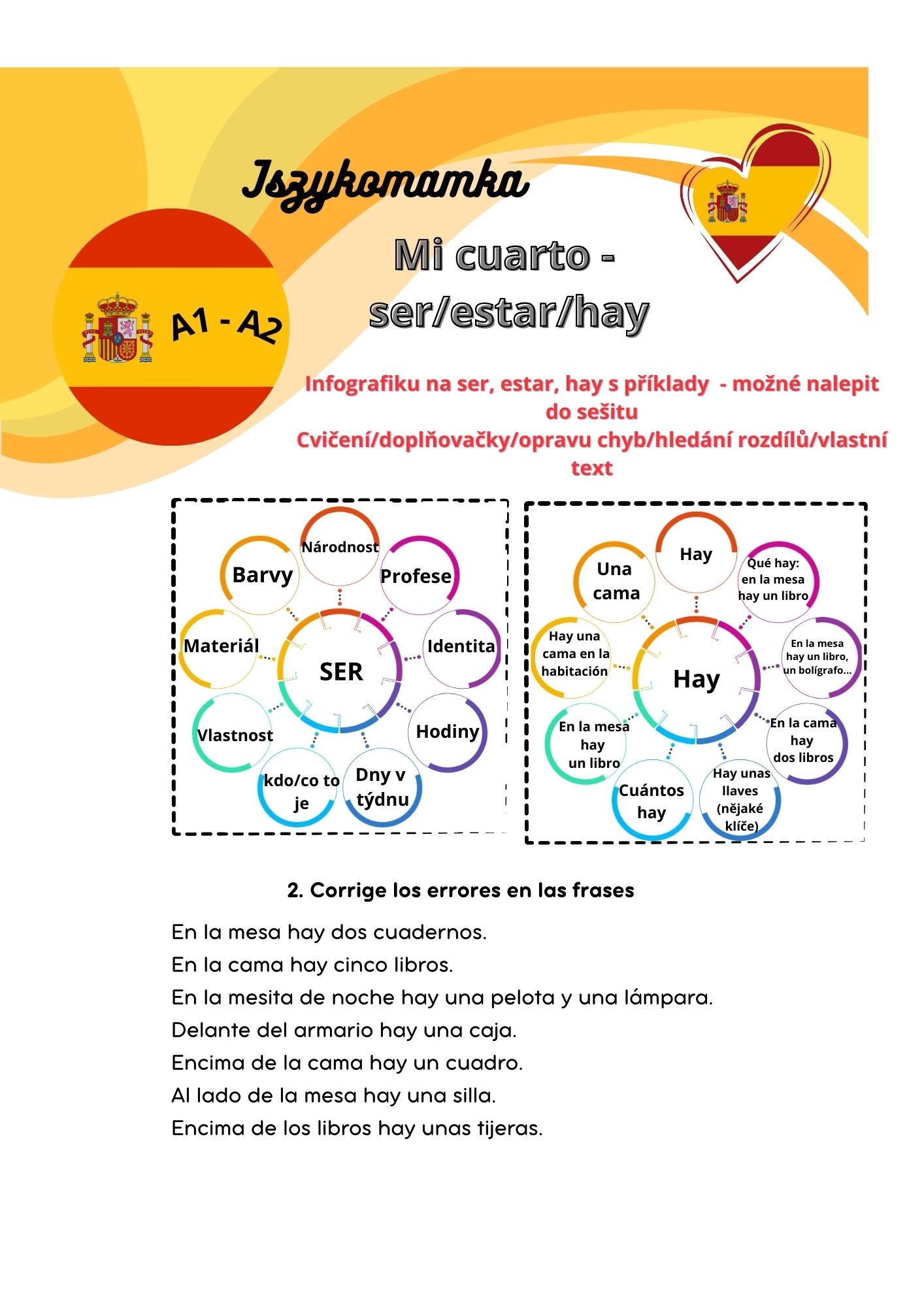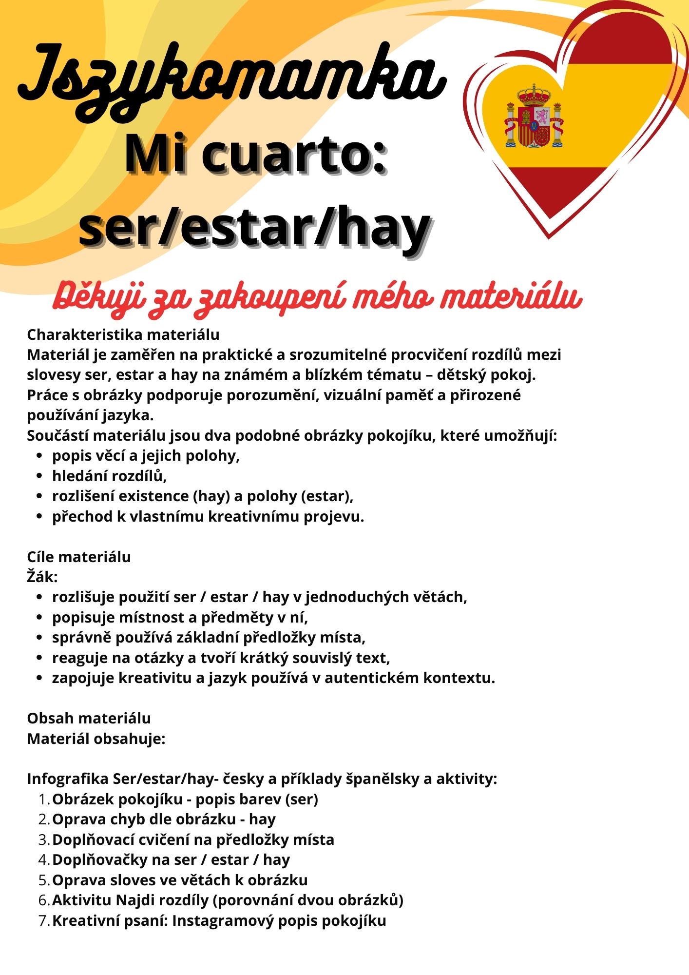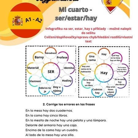 Procvičování ser, estar a hay pomocí obrázků pokojíku. Žáci hledají rozdíly mezi dvěma obrázky, doplňují věty, odpovídají na otázky a tvoří vlastní krátký text – popis pokojíku ve stylu Instagramu. Materiál zahrnuje cvičení na předložky místa, hledání chyb ve větách a kreativní psaní. Ideální pro úroveň A1–A2.