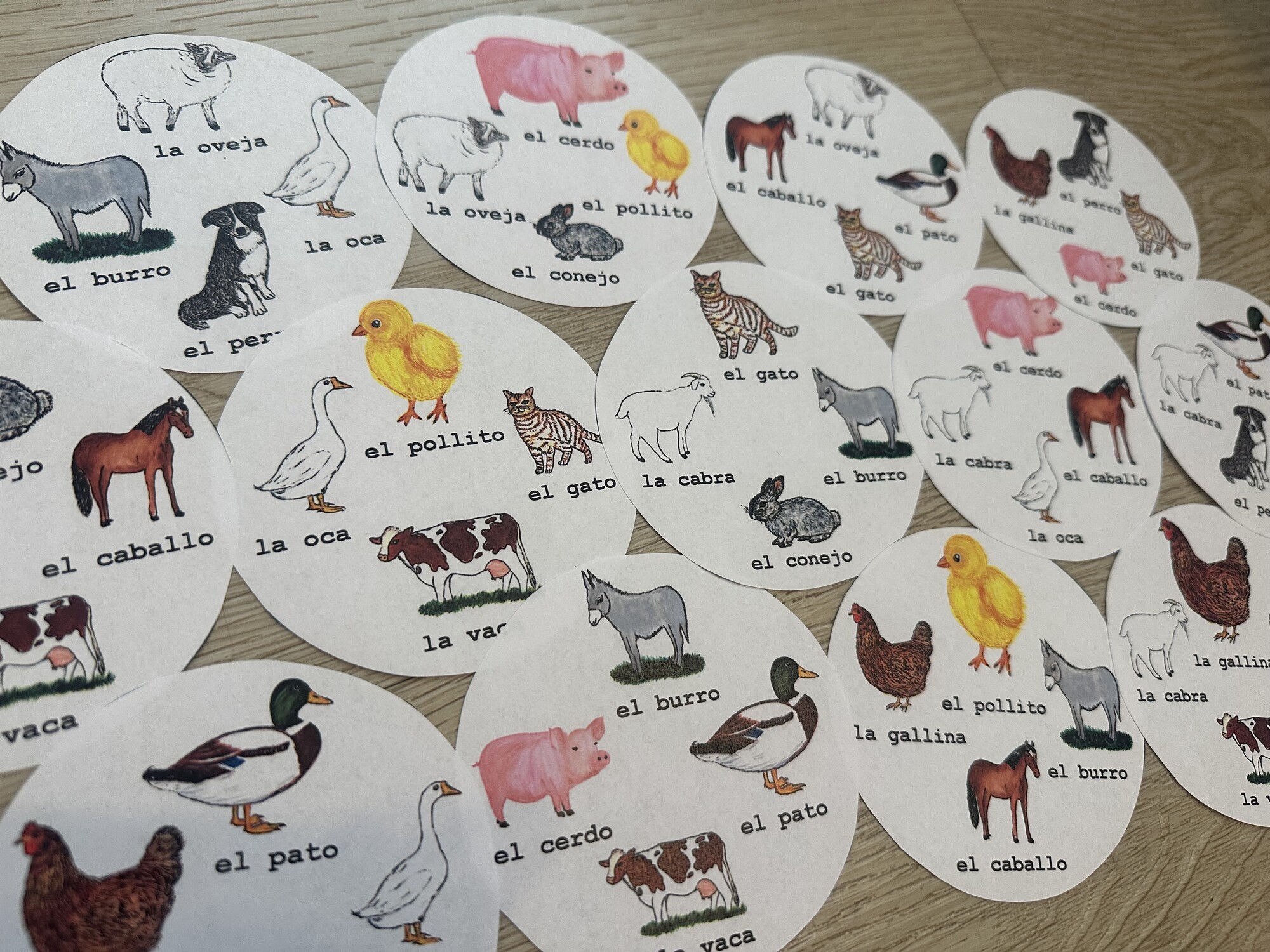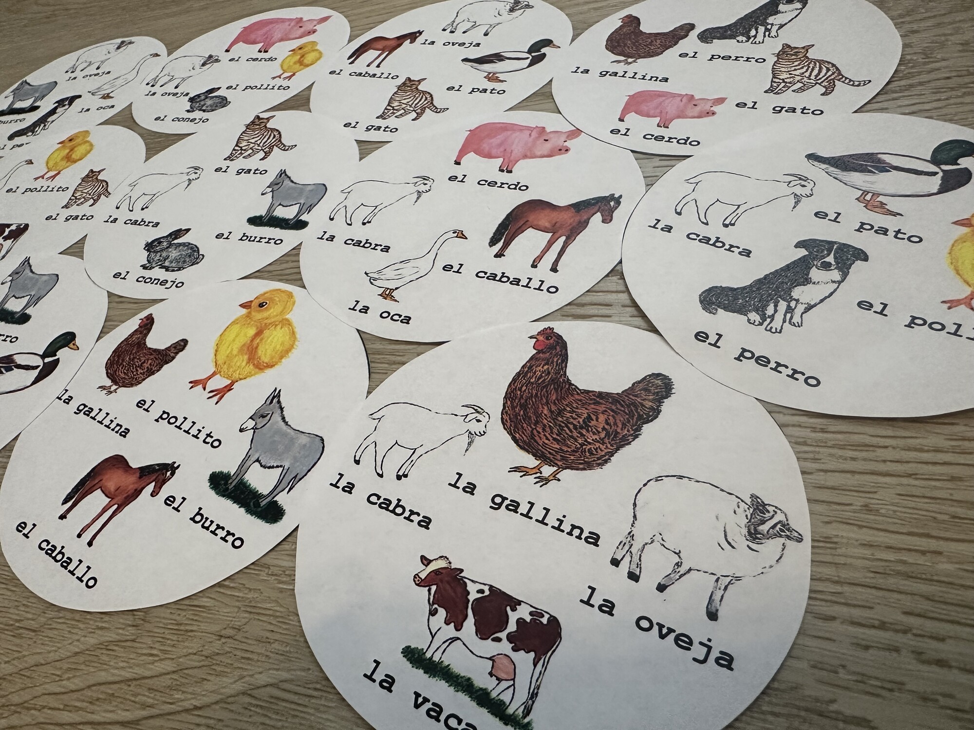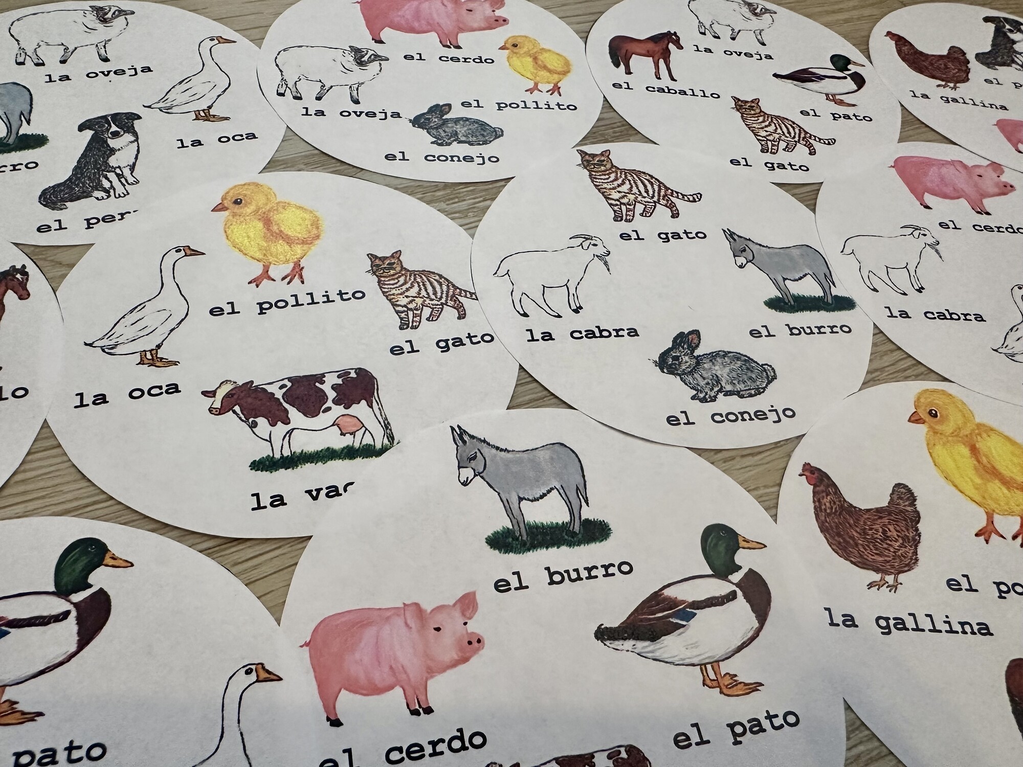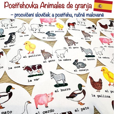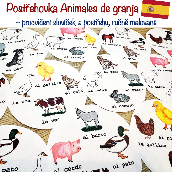 Materiál se skládá z 4 A4 stran hry – 13 karet postřehové hry na téma Animales de granja. Procvičení slovíček a postřehu. Ručně malované obrázky.