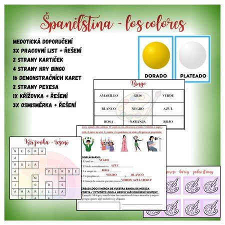 Soubor obsahuje 30 stran aktivit na téma barvy ve španělštině. Je koncipován pro úplné seznámení s tématem barev od začátku a obsahuje úlohy od jednodušších k obtížnějším. Slouží jako podpůrný materiál pro výuku či samostudium. Součástí je také podrobné vysvětlení tématu, užití ve větách a kontextu, gramatické jevy a specifika daných slovíček.