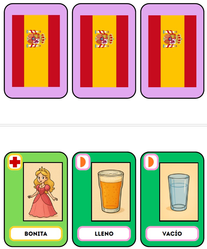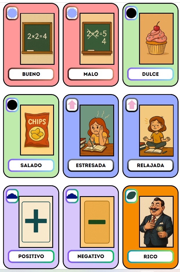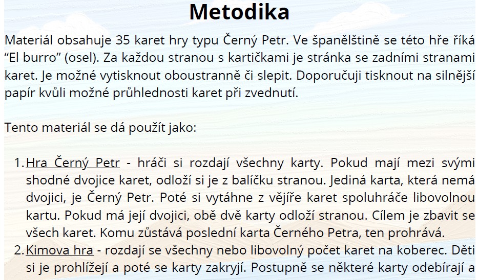 Materiál slouží jako didaktická hra pro vyučující španělského jazyka. V souboru se nachází celkem 9 stran - 1. strana metodických doporučení a další strany obsahují rubové a lícové strany karet. Karty jsou zaměřeny na přídavná jména ve španělštině - na protiklady.