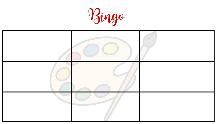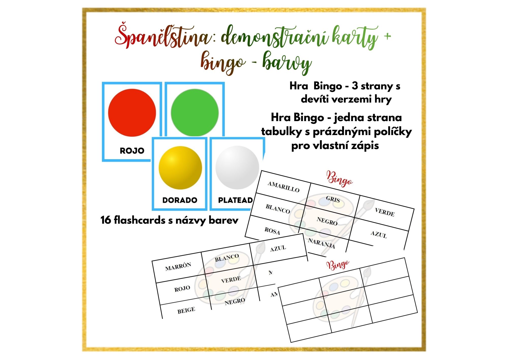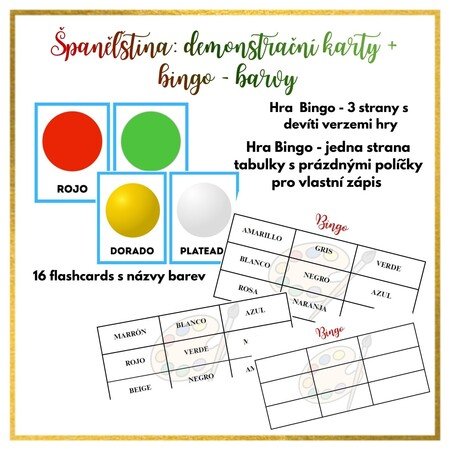 🟡 3 různé strany s předtištěnými názvy barev pro hru Bingo