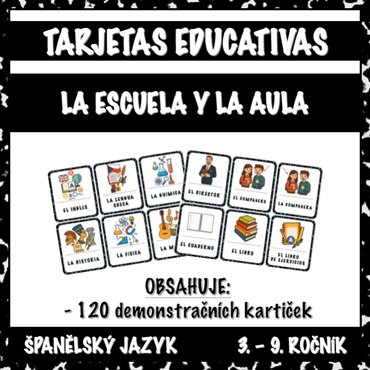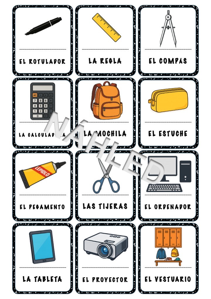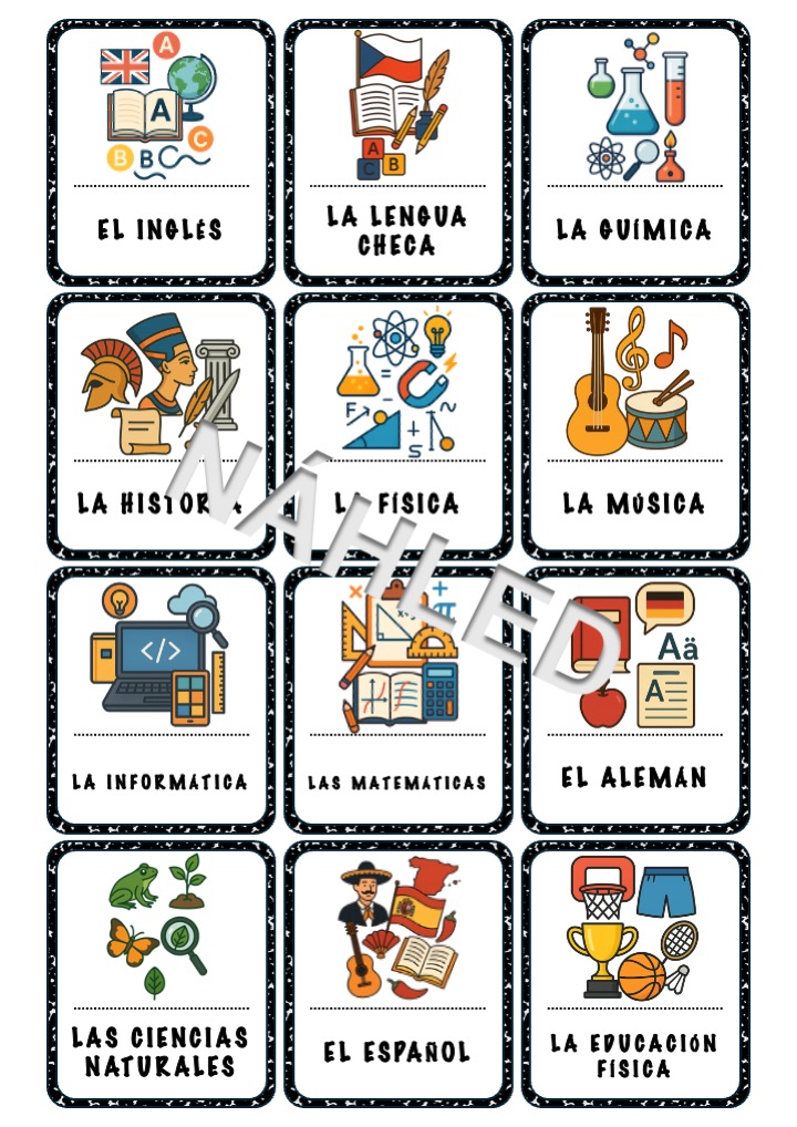- Vizuálně atraktivní aktivita, která pomáhá žákům osvojit si slovní zásobu na téma školní prostředí ve španělštině. Kartičky lze využít k frontální výuce, skupinové práci, hrách nebo samostatnému procvičování slovní zásoby. Aktivita podporuje zapamatování názvů objektů ze školního prostředí, rozšiřuje slovní zásobu a zlepšuje výslovnost. Je ideální pro žáky, kteří se učí španělštinu jako cizí jazyk na úrovni A1–A2 a vytváří poutavou atmosféru v hodině.
