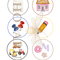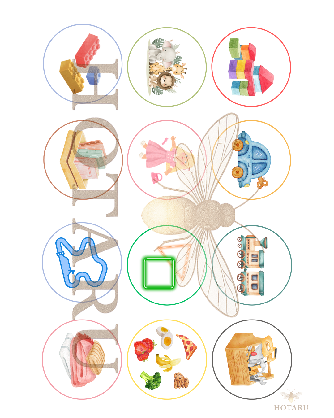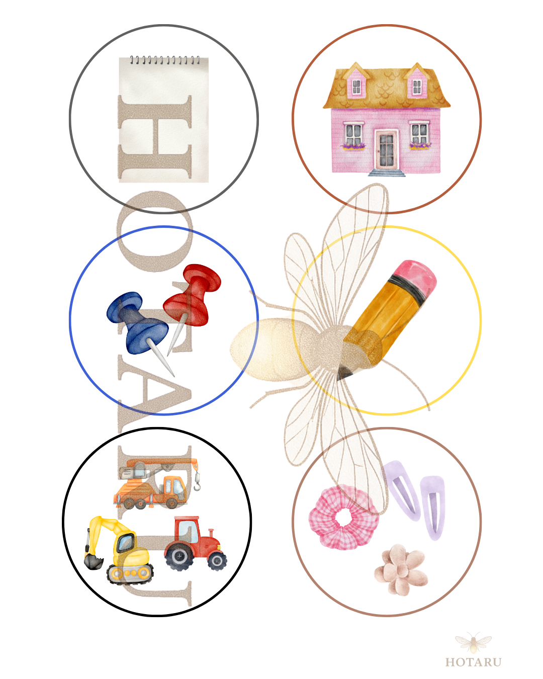 Piktogramy obrázků věcí ve třídě (panenky, auta, sponky aj.)